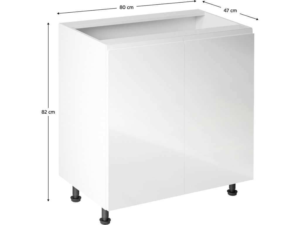 Spodní skříňka, Aurora D80 Provedení: DTD laminové / MDF Barva: bílá / bílá extra vysoký lesk Rozměry (ŠxHxV): 80x47x82 cm Tloušťka materiálu: 15 mm Pracovní deska není součástí skříněk. Je možné si doobjednat pracovní desku v provedení dub lefkas tmavý tloušťky 38 mm za 1.350 Kč / bm. Možnost dokoupit dřez LAY ON. Ke každé dolní skříňce, kromě D25PZ, je třeba doobjednat 2ks úchytů na sokel- cena 20 Kč. Spodní skříňky jsou dodávány včetně dolní lišty, avšak přesný rozměr, který potřebujete, je třeba uvést do poznámky v objednávce. Pokud rozměr neuvedete, může se stát, že vám sokl nebude dodán.