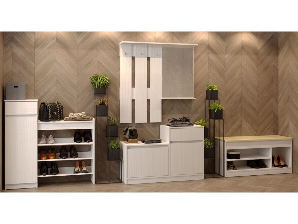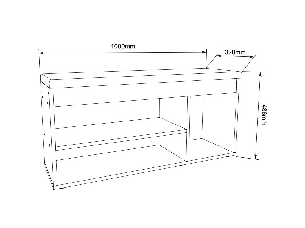 Botník s policí je vyrobený z desky LTD v barvě bílá. Pod vyklápěcím polstrovaným sedákem je praktický úložný prostor. Dodáváme v demontovaném stavu.Doplňkové parametry