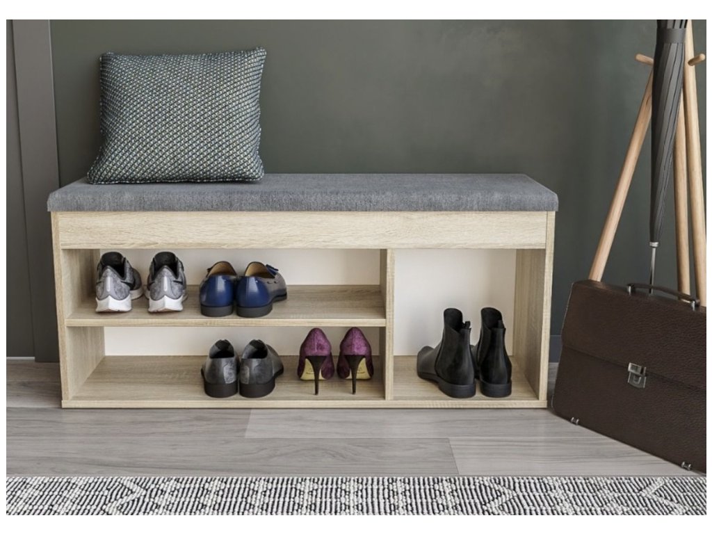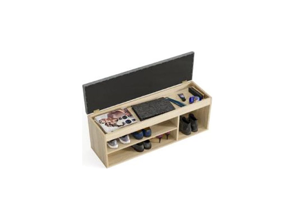 Botník s policí je vyrobený z desky LTD v barvě dub sonoma. Pod vyklápěcím polstrovaným sedákem je praktický úložný prostor. Barevné provedení sedáku se může od obrázku lišit. Dodáváme v demontovaném stavu.Doplňkové parametry