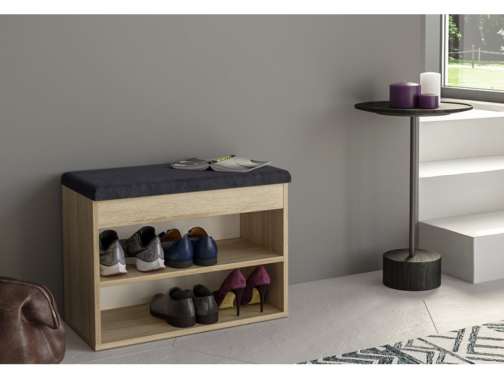 Botník s policí je vyrobený z desky LTD v barvě dub sonoma. Pod vyklápěcím sedákem je praktický úložný prostor. Barevné provedení sedáku se může od obrázku lišit. Dodáváme v demontovaném stavu.Doplňkové parametry