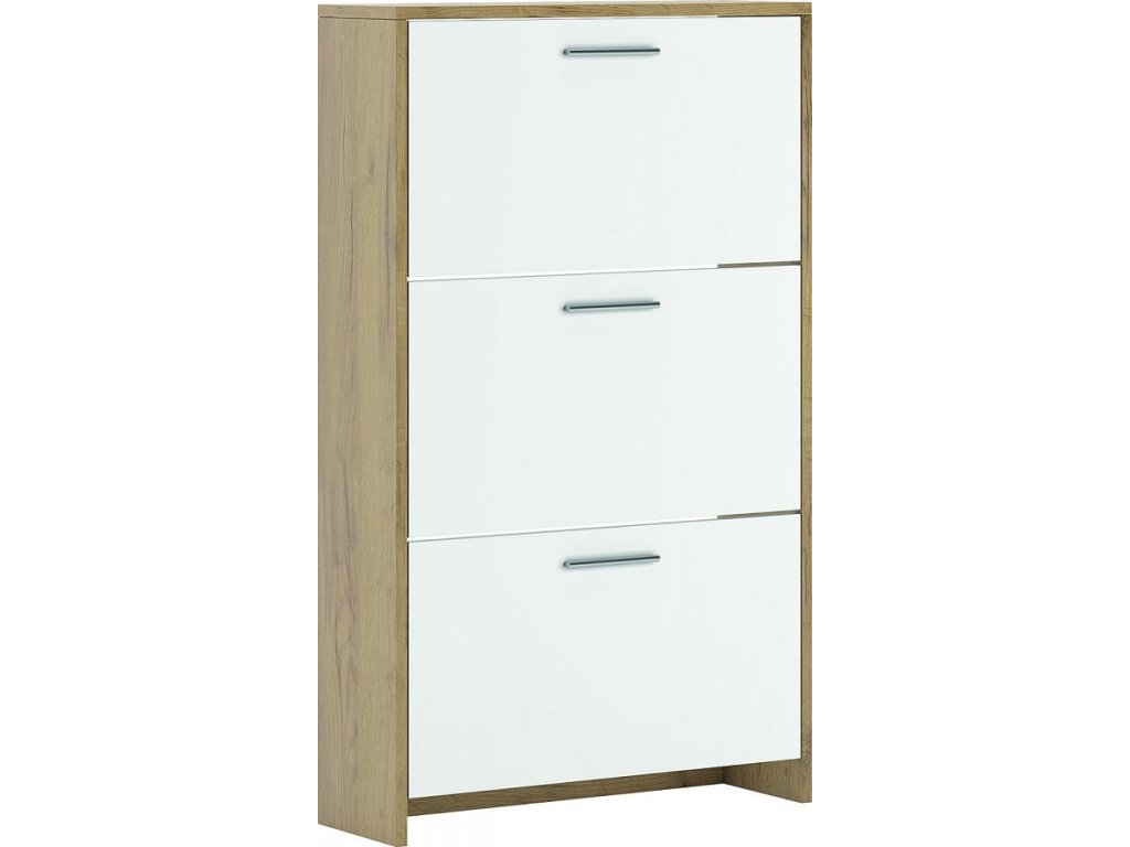 O stylový design Vaší vstupní části se postará moderní botník . Kombinace moderních barev jako dub atelier light v kombinaci s bílou matnou barvou jí dodává jedinečný charakter. Za praktický rozměr sestavy jsou zodpovědné úložné prostory v podobě tří výklopných dvířek.