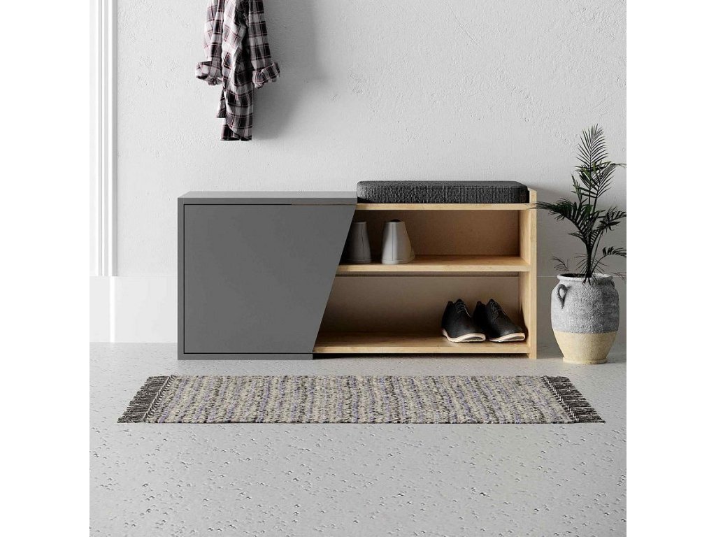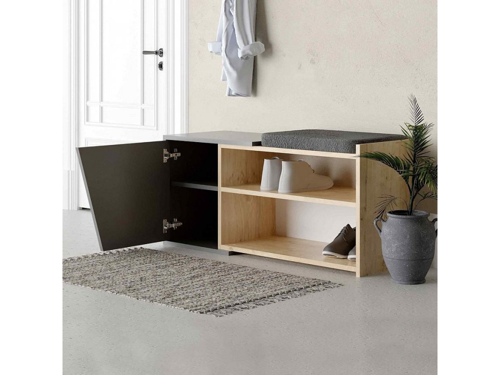 Náš botník není jen praktický, ale také esteticky přitažlivý, díky kombinaci barev dubu a antracitu. Plná dvířka skříňky nabízejí dostatek úložného prostoru pro vaše obuvi a příslušenství, zatímco pohodlné sezení a lavice poskytují příjemné místo k obouvání.