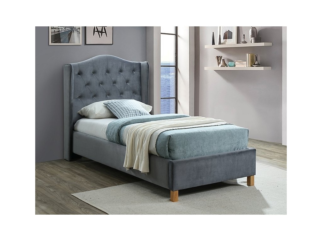 Čalouněná postel originálního vzhledu s prošíváním bude jako královská lóže pro ty, co si potrpí na styl a eleganci. Konstrukce je potažena látkou aksamit šedé barvy, nožky jsou ze dřeva v barvě dub vysoké 10 cm. Rošt je součástí postele ( klasický lamelový rošt v plastových pouzdrech ). Matraci nutno doobjednat o rozměrech 90 x 200 cm. Dodáváme v demontovaném stavu.Doplňkové parametry