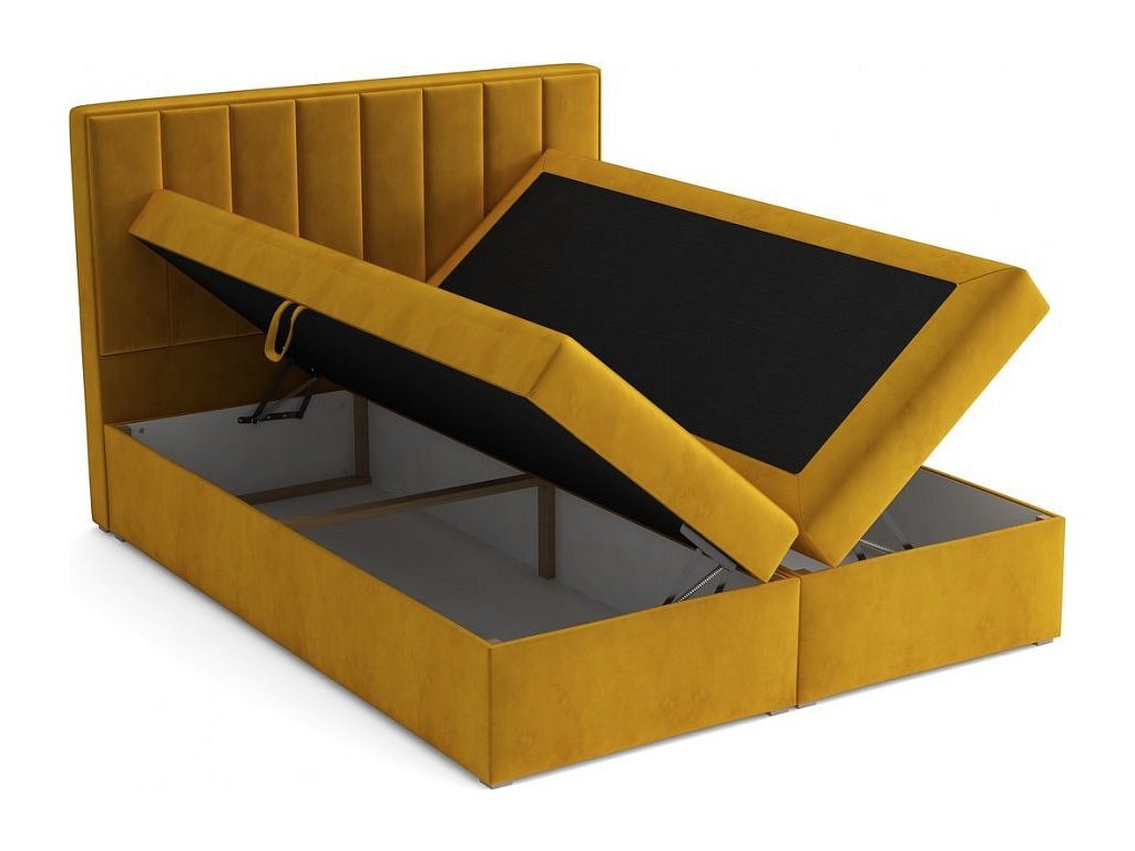Elegantní kontinentální postel moderního vzhledu s vysokým čelem s dekoračním prošíváním. Postel se dodává zároveň s matrací - boxspring styl. Pevná konstrukce postele je potažena látkou v barvě Bluvel 14. Na ní se nachází vysoká bonelová matrace potažena stejnou látkou. Na ní je druhá tenká matrace v celku vyrobena z kvalitní hrubé PUR pěny tzv. topper (výška cca 5 cm). Ložní plocha činí 160 x 200 cm. Výška ložné plochy od země je cca 53 cm. Rozměry úložného prostoru - 2x (197x67x30 cm). Úložný prostor je k dispozici nadzvednutím matrace z boční strany postele.Doplňkové parametry