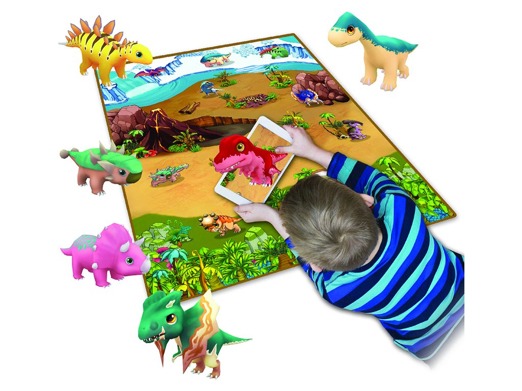 Krásný barevný koberec o rozměru 200 x 120 cm. Motivem tohoto koberečku jsou dinosauři a jejich prostředí. Každý z dinosaurů, při použití mobilního telefonu, tabletu a stažené aplikace ožívá.