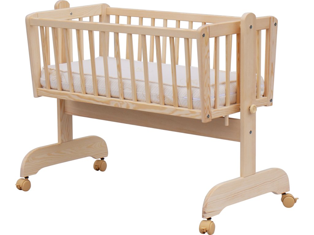 Krásná kolébka z borovicoveho dřeva je ideální pro usínání miminek.