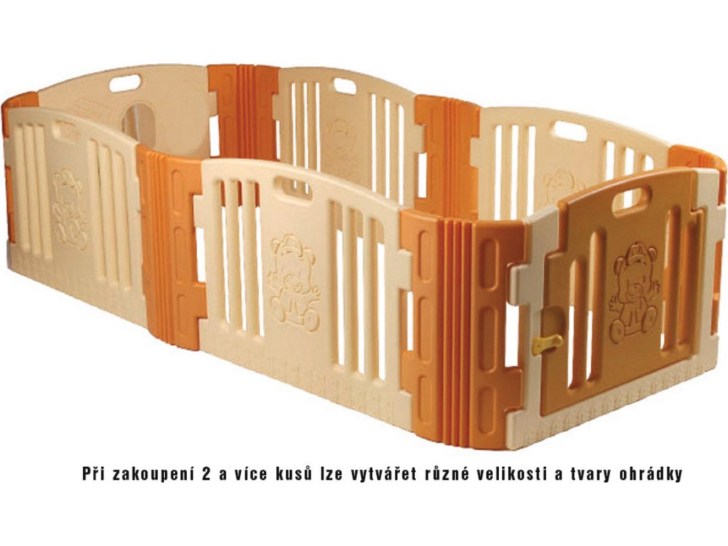 Ohrádka má základní rozměr 116 x 116 x 60 cm, ale lze ji spojovat s další stejnou ohrádkou. Zakoupením více kusů ohrádky je možné vytvořit velké množství velikostí, ale i tvarů, protože rohy ohrádky jsou ohebné.