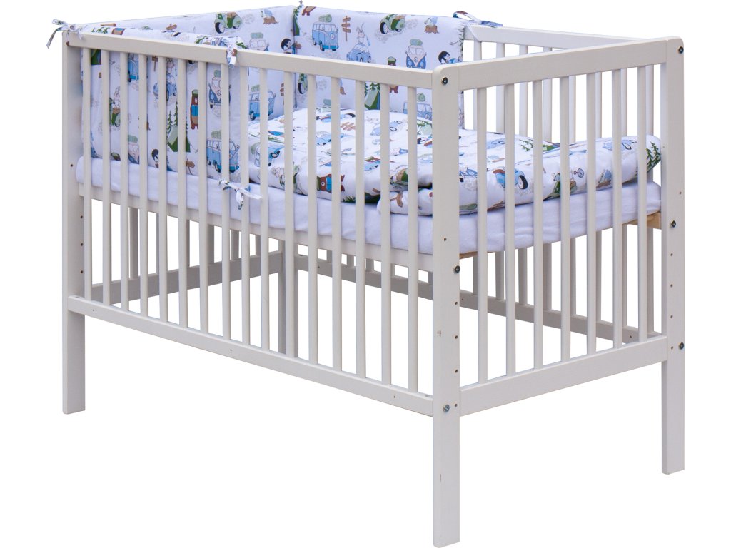 1. Dětská dřevěná postýlka 120 x 60 cm - bílá, masiv borovice, 3 vyndavací příčky, 5 poloh roštu, nohy postýlky jsou předvrtané pro nasazení koleček