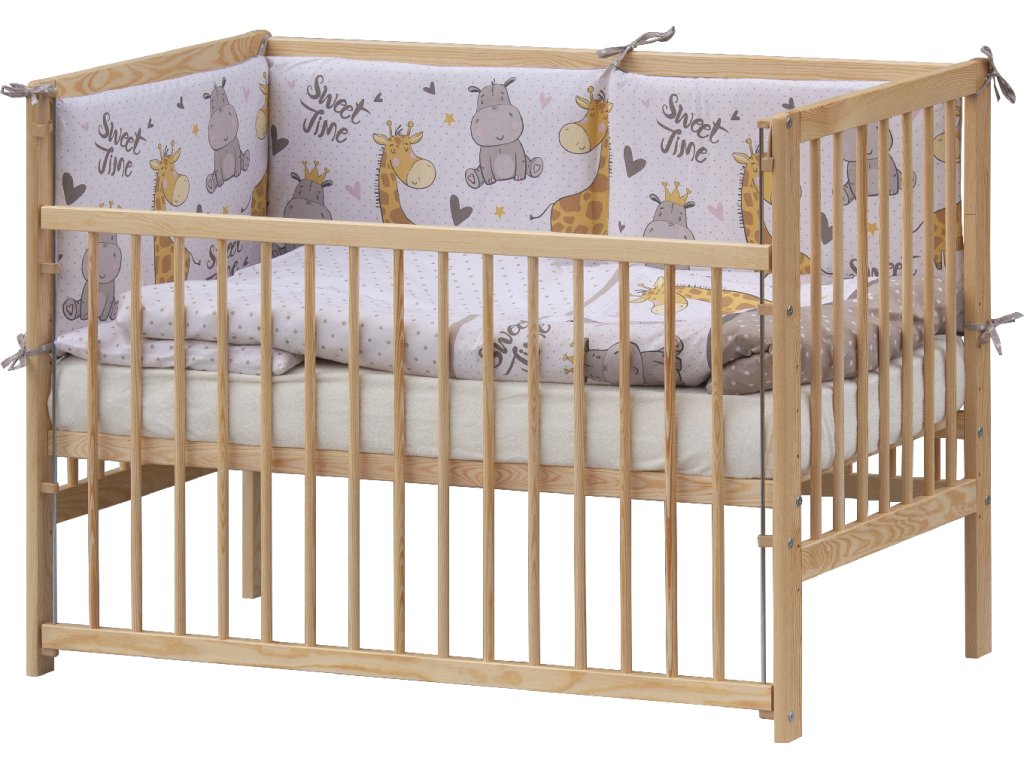 1. Dětská dřevěná postýlka 120x60 cm - přírodní, masiv borovice, stahovací bok, 6 poloh roštu, nohy jsou předvrtané pro možné nasazení koleček