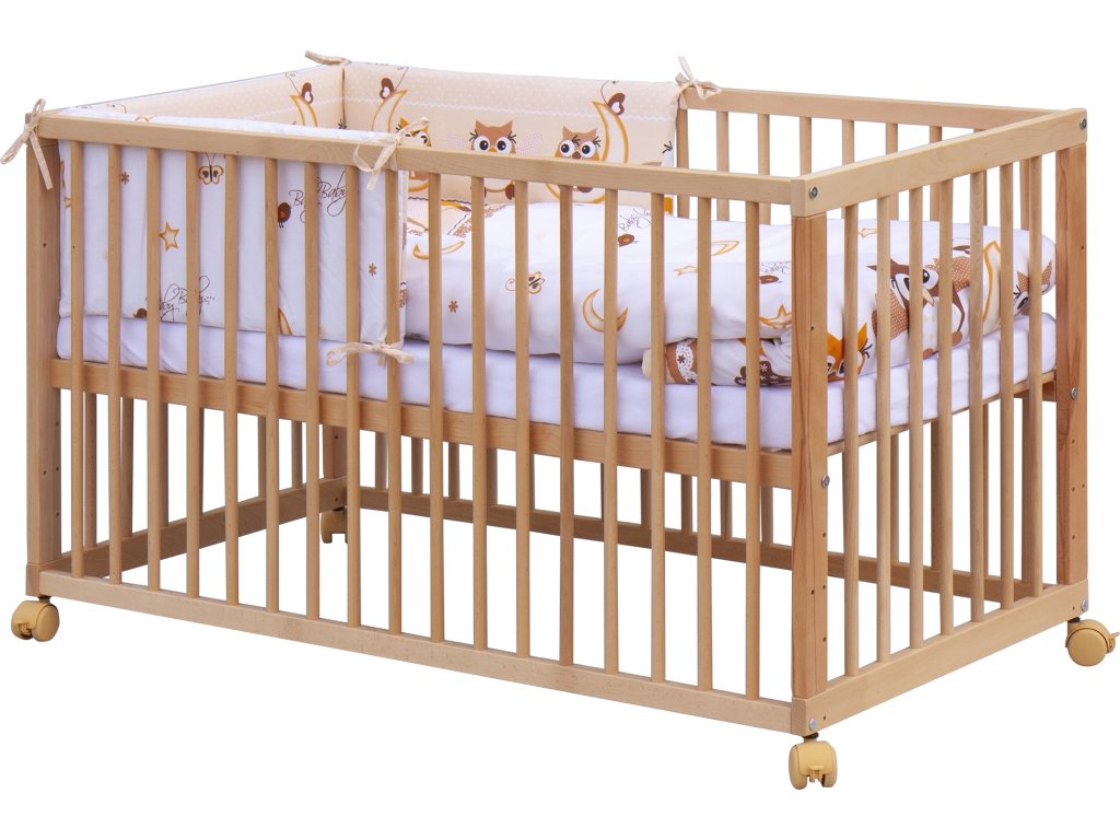 1. Dětská dřevěná postýlka 120 x 60 cm - přírodní, masiv buk, 3 vyndavací příčky, 5 poloh roštu, nohy postýlky jsou předvrtané pro nasazení koleček