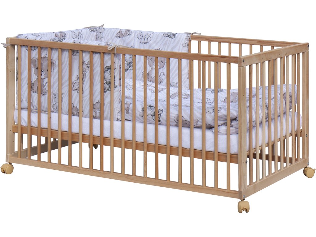1. Dětská dřevěná postýlka 140x70 cm - přírodní, masiv buk, 3-vyndavací příčky, 5-poloh roštu