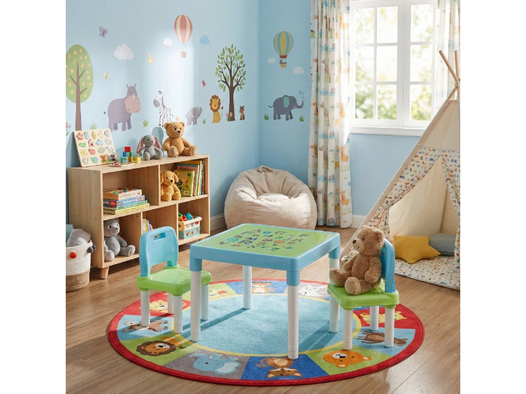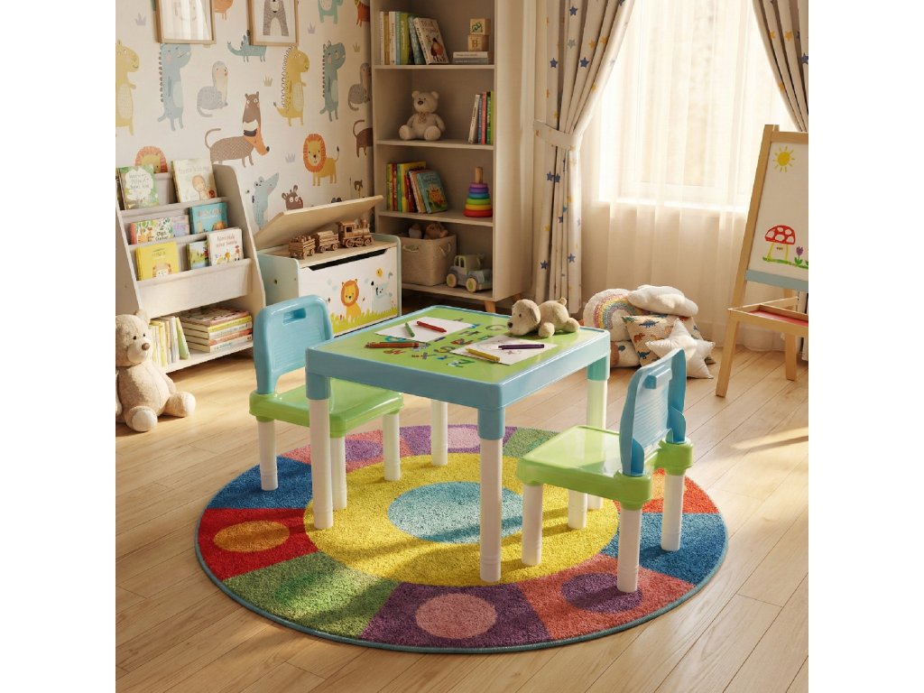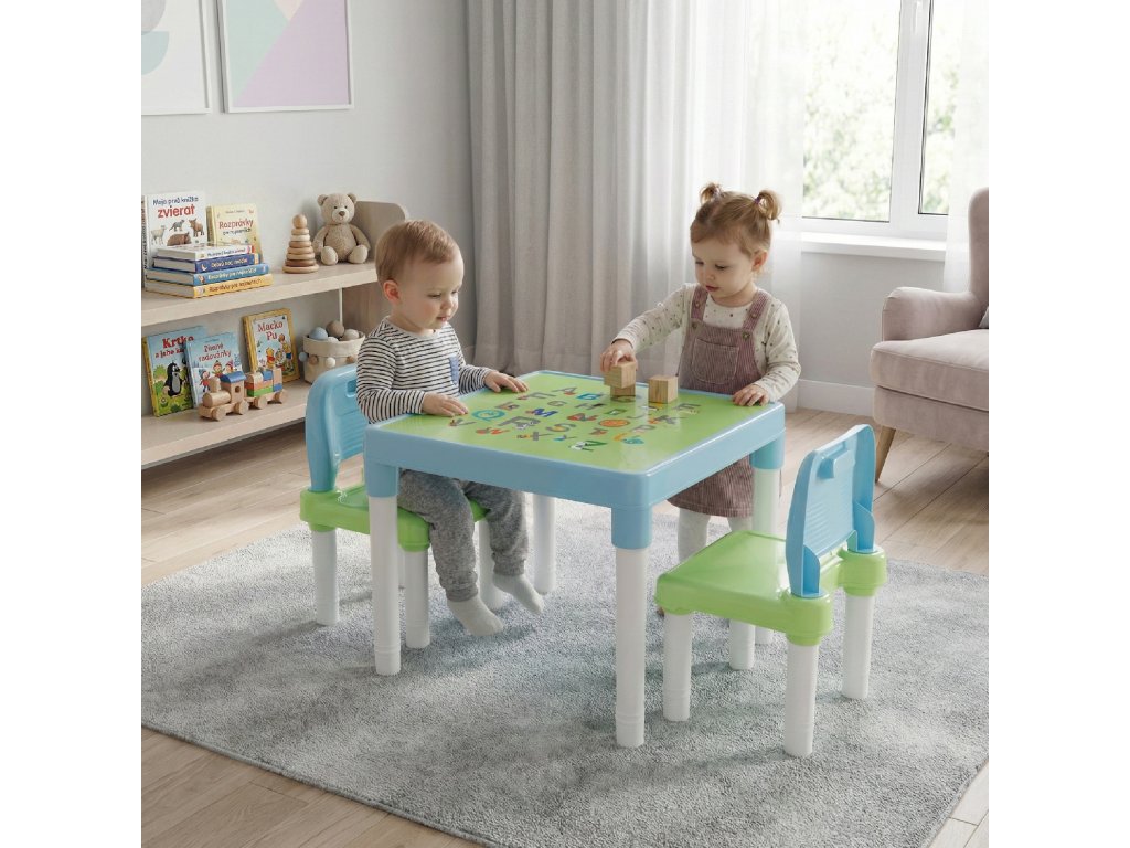 Materiál: plast Barva: modrá / zelená / bílá Stůl (ŠxHxV): 51,5x51,5x44 cm Židle (ŠxHxV): 30x28x46 cm Výška sedu: 23 cm Hloubka sedu: 28 cm Šířka sedu: 28 cm Šířka zádové opěrky: 30 cm Výška zádové opěrky: 18 cm Nosnost: 50 kg Set 1 + 2 jeden stůl dvě židle Dodávané v demontu