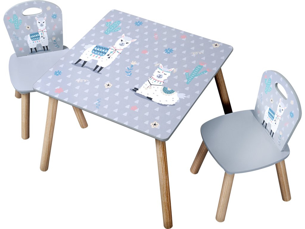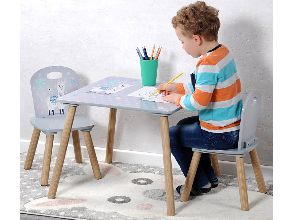 Neodolatelný dětský stoleček s židlemi v šedém provedení s nádherným motivem roztomilé lamy od německého výrobce. Stoleček je ideálním místem pro hraní, malování, občerstvení nebo pro posezení s kamarády. Originální doplněk do dětského pokoje, praktický, přizpůsobený dětským potřebám. Nábytek je robustní a stabilní, snadno se čistí.