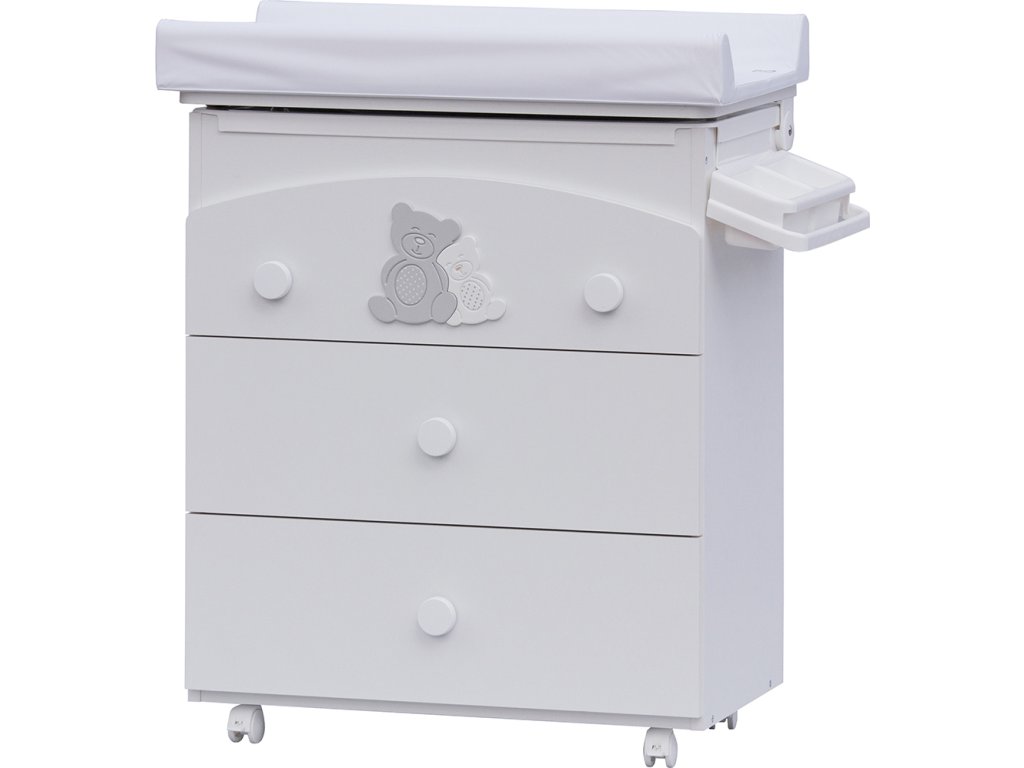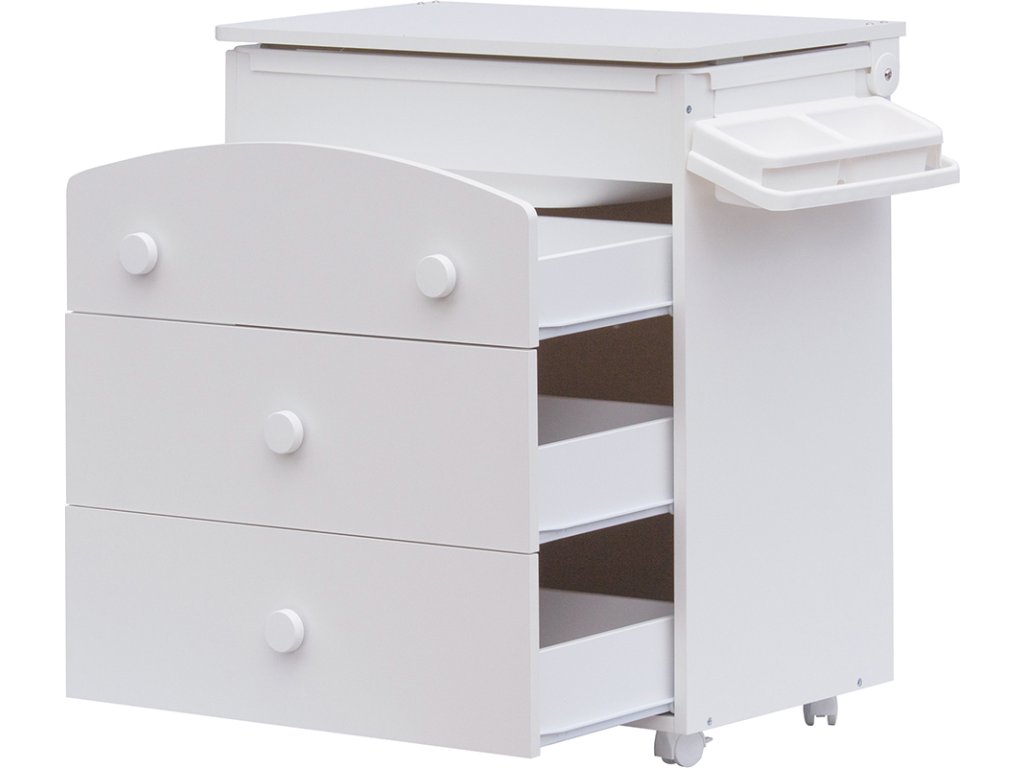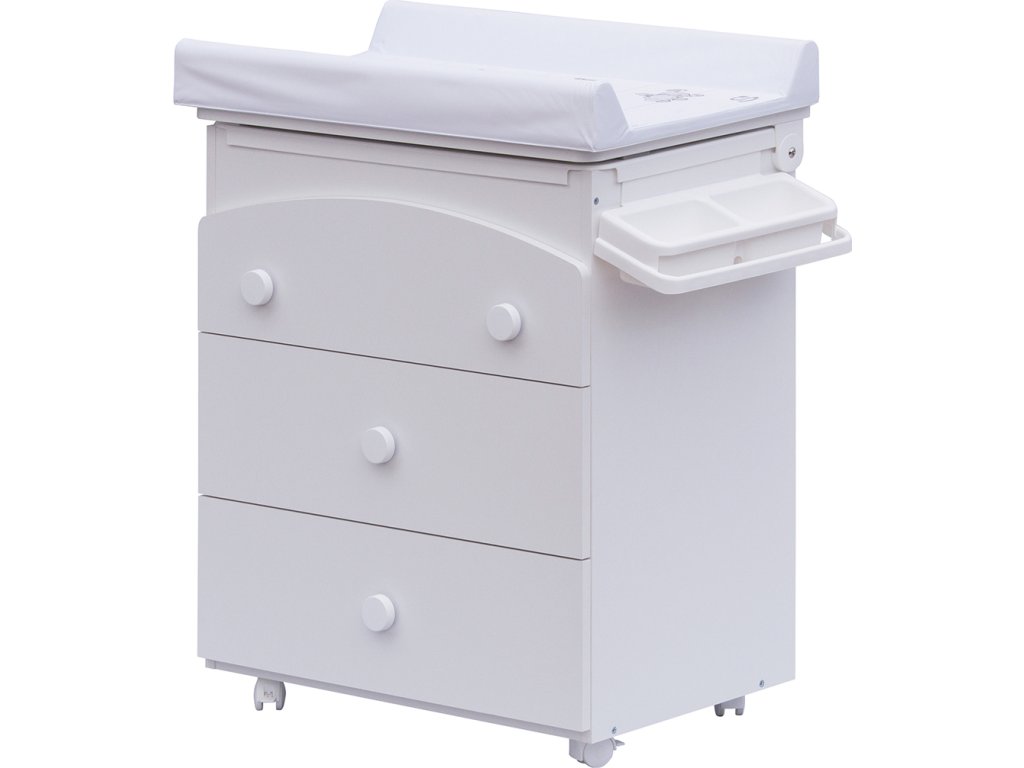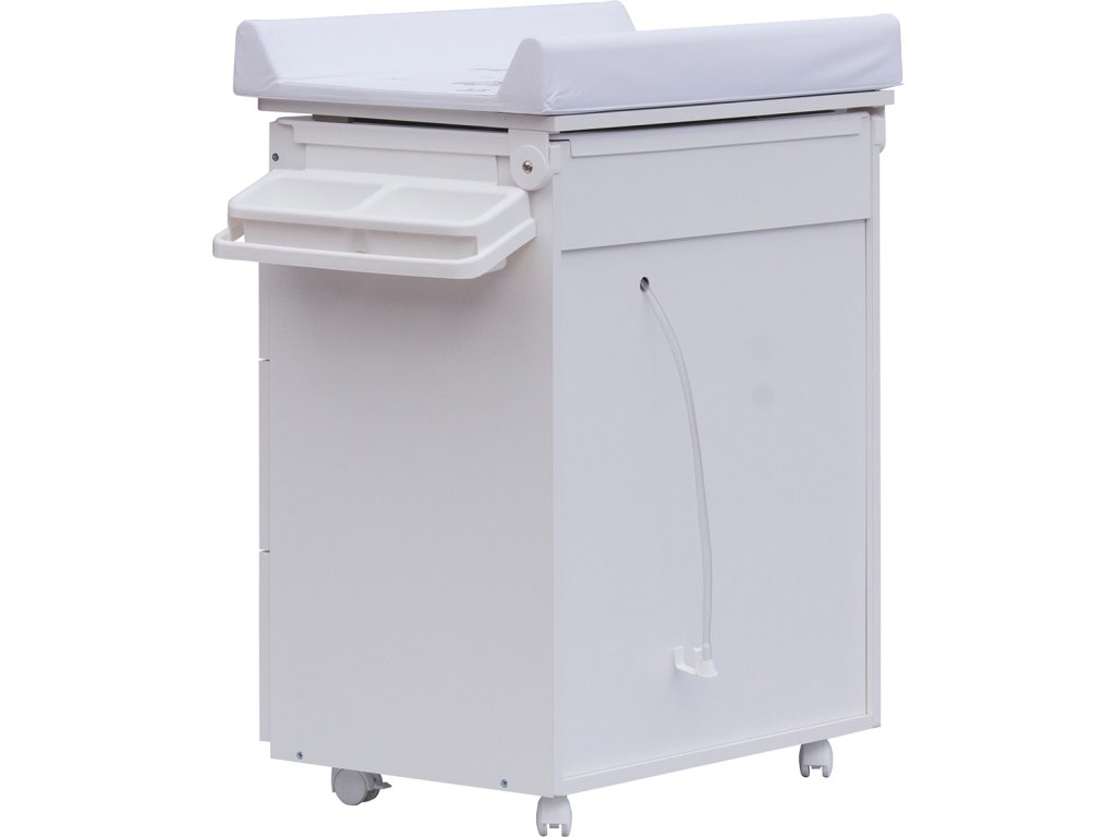 Laminátová přebalovací komoda je doplněna o plastovou vaničku s odkládacími boxy. Vanička je umístěna pod deskou. Pro snadný odvod použité vody je komoda doplněna výtokovou hadicí s uzávěrem. Vaničku lze zcela vyjmout a komodu lze používat jako běžný nábytek do dětského pokoje.
