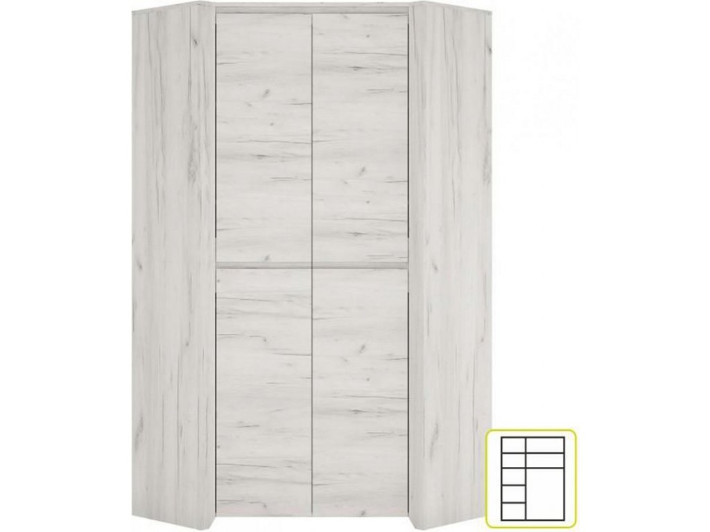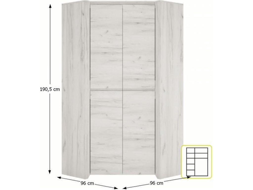 Dvoudveřová rohová skříň TYP 21 ze sektorové sestavy ANGEL Materiál: laminovaná DTD Barva: bílá craft Rozměry (ŠxHxV): 96x96x190,5 cm Tloušťka materiálu: 16 mm Výška spodního prostoru od podlahy: 2,5 cm Dodávané v demontu