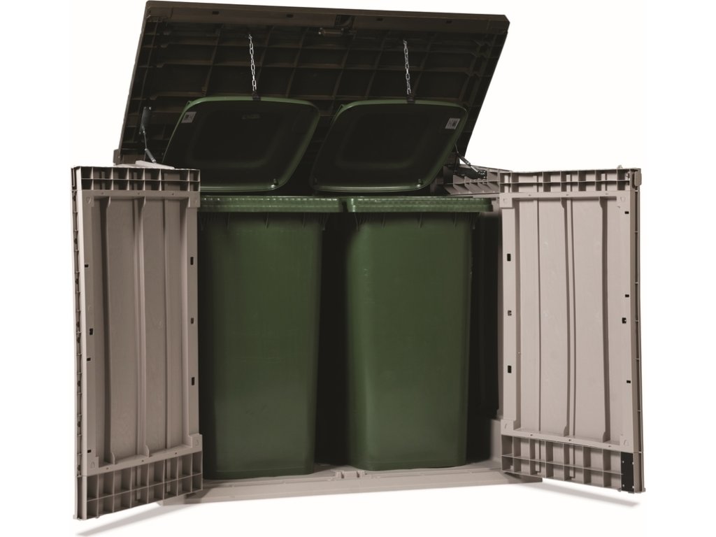 S nesmírně praktickými dvoukřídlými dveřmi a otevíracím víkem, které lze ovládat snadno a hladce díky pístům (vzduchovým vzpěrám), se dostanete ke svému vybavení během okamžiku. Přístup do skříně je navíc ještě usnadněn šikmým prahem, který umožňuje snadné uskladnění například popelnic nebo jiných předmětů.
