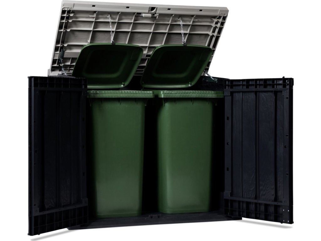 S nesmírně praktickými dvoukřídlými dveřmi a otevíracím víkem, které lze ovládat snadno a hladce díky pístům (vzduchovým vzpěrám), se dostanete ke svému vybavení během okamžiku. Přístup do skříně je navíc ještě usnadněn šikmým prahem, který umožňuje snadné uskladnění například popelnic nebo jiných předmětů.