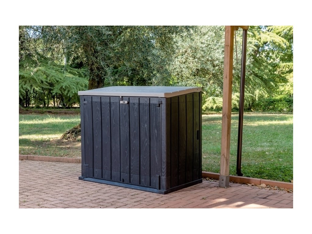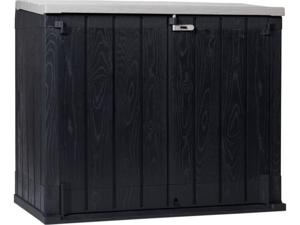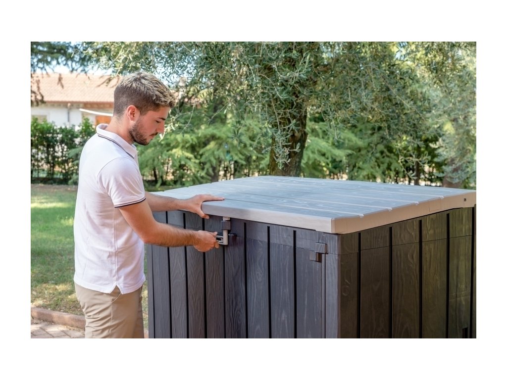 Eleganci dodává její imitace dřevěného povrchu, která je doplněna barevným provedením grafitových stěn a světle šedého víka, čímž se skříň stává nejen praktickým prvkem, ale také stylovým doplňkem Vaší zahrady.