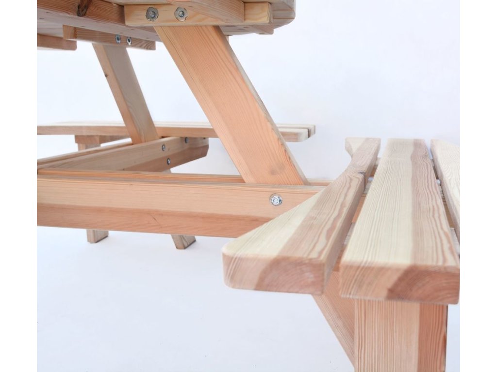 Díky použitému materiálu a jeho zpracování je lavice velmi odolná a kvalitní. Přírodní provedení umožňuje soupravu natřít a ošetřit dle vlastní představy.