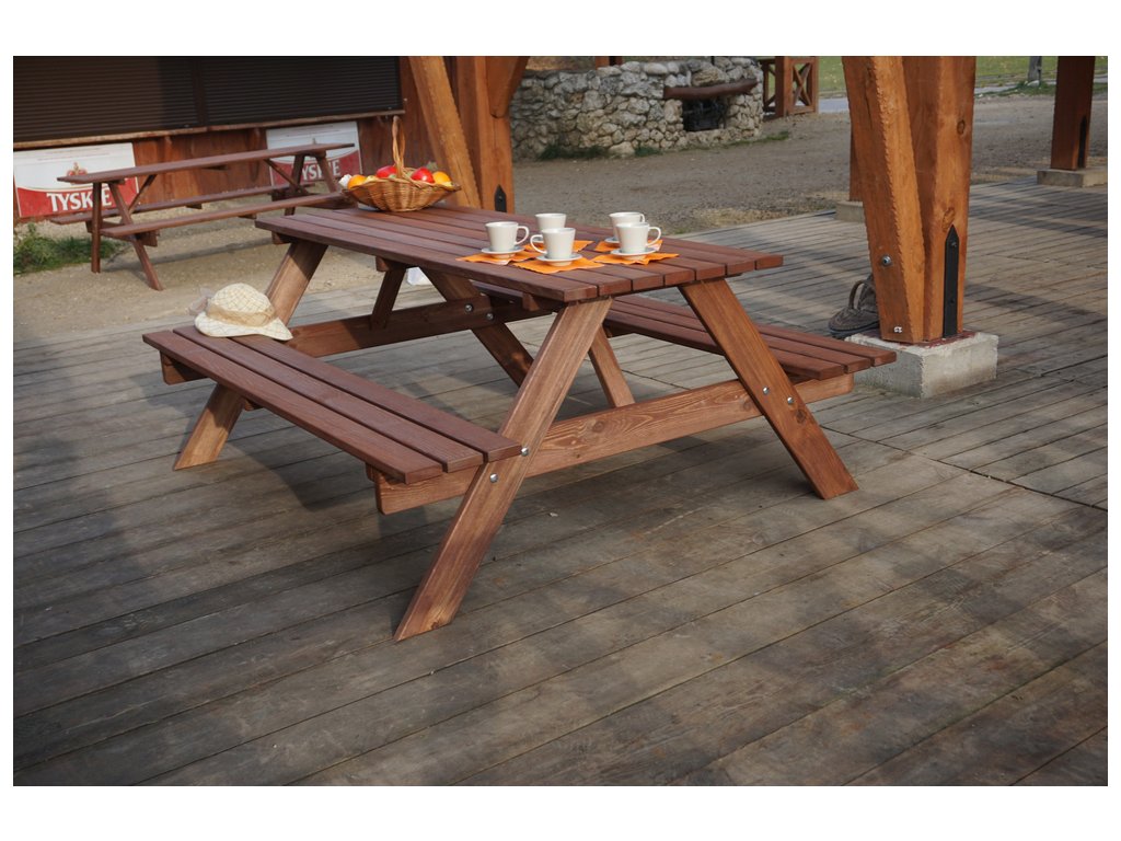 Zahradní sestava PIKNIK je zhotovena z kvalitního borovicového dřeva. Dřevo je impregnované do kaštanové barvy.