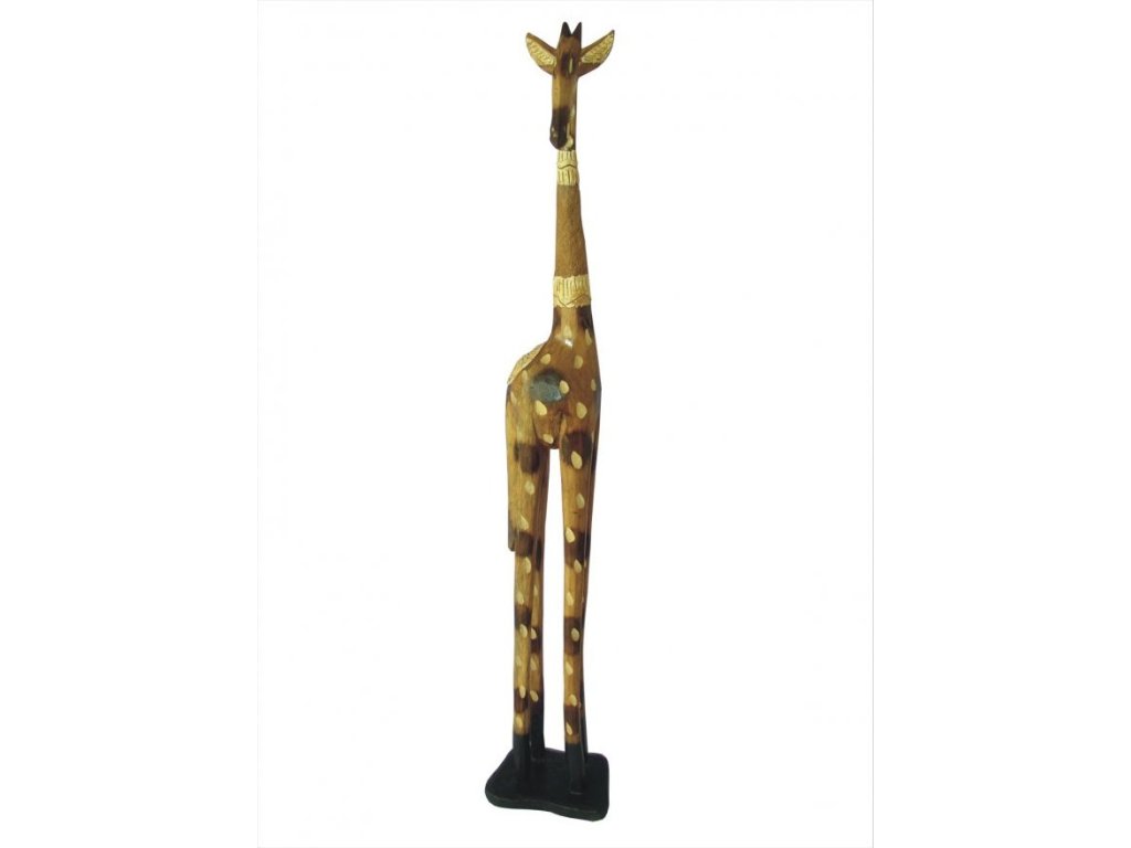 Žirafa je vyřezána ručně z masivního měkkého dřeva, barvena je taktéž ručně, každý kus je tak originál. | Výška sošky je 100 cm