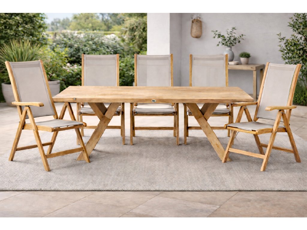 Masivní stůl Spider recykl (200x100cm) v kombinaci 6x křeslo DIVA s batyline výpletem.