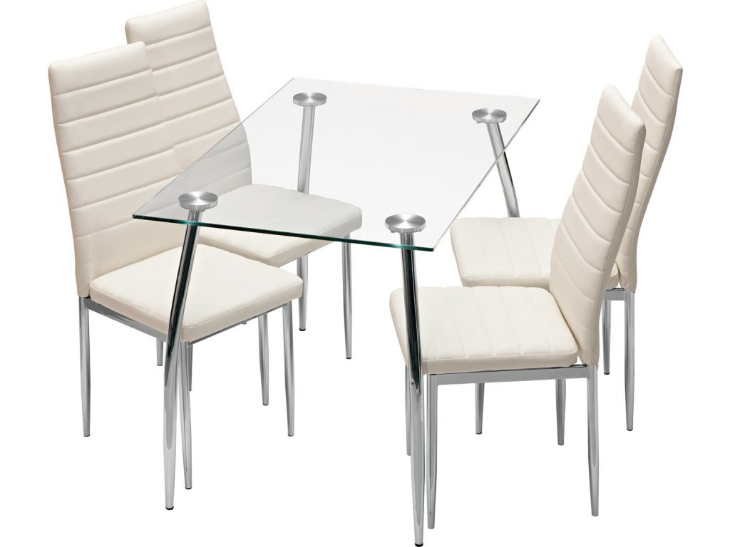 jídelní stůl GRANADA 3015 a 4 jídelní židle MILÁNO 3009 stůl: kombinace kov / čiré tvrzené sklo, chromované nohy židle: potah kůže – imitace, barevné provedení krémově bílá kovové chromované nohy, výška sedu 46 cm rozměr stolu (š/h/v) 110 × 70 × 74 cm rozměr židle (š/h/v) 41 × 40 × 98 cm
