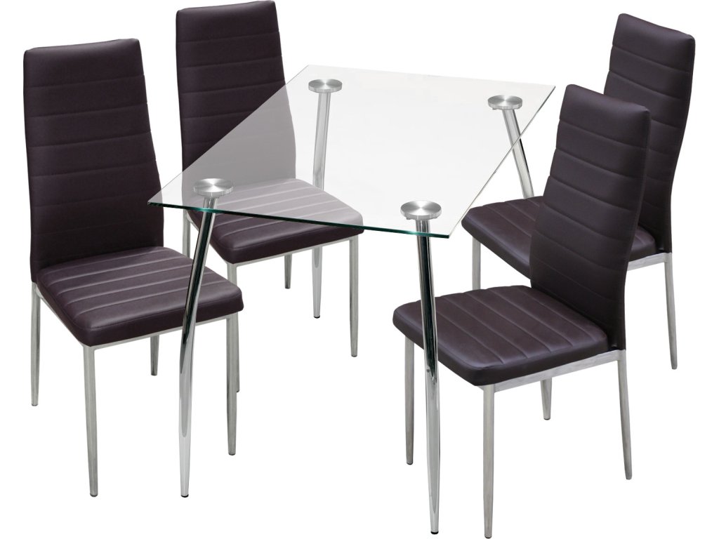 jídelní stůl GRANADA 3015 a 4 jídelní židle MILÁNO 3010 stůl: kombinace kov / čiré tvrzené sklo, chromované nohy židle: potah kůže – imitace, barevné provedení hnědá kovové chromované nohy, výška sedu 46 cm rozměr stolu (š/h/v) 110 × 70 × 74 cm rozměr židle (š/h/v) 41 × 40 × 98 cm
