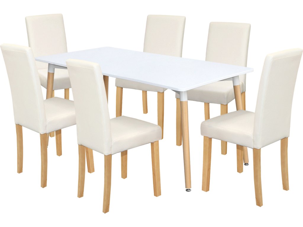 jídelní stůl ONE 3153 a 6 jídelních židlí PRIMA 3037 stůl: deska MDF, barevné provedení bílá kovová konstrukce, barevné provedení bílá kulaté nohy, materiál masiv buk židle: potah kůže – imitace, barevné provedení bílá nohy masiv čirý lak, výška sedu 47 cm rozměr stolu (š/h/v) 160 × 90 × 74 cm rozměr židle (š/h/v) 45 × 55 × 90 cm