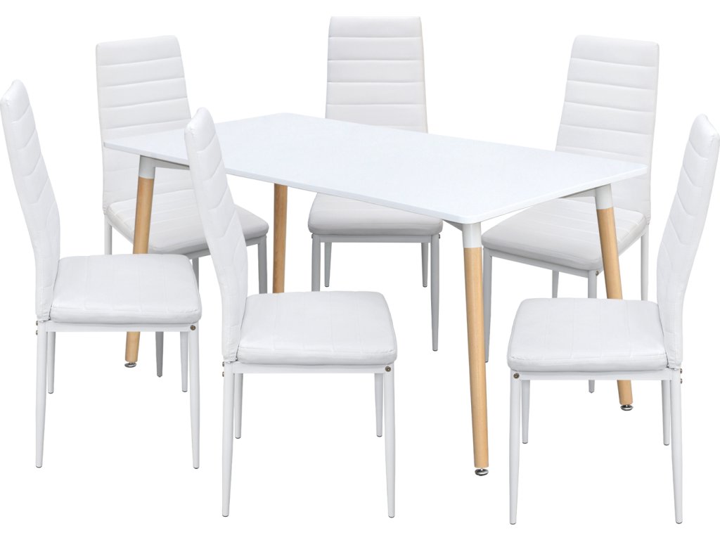 jídelní stůl ONE 3153 a 6 jídelních židlí SIGMA 3164 stůl: deska MDF, barevné provedení bílá kovová konstrukce, barevné provedení bílá kulaté nohy, materiál masiv buk židle: potah kůže – imitace, barevné provedení bílá kovové nohy a konstrukce, výška sedu židle 47 cm rozměr stolu (š/h/v) 160 × 90 × 74 cm rozměr židle (š/h/v) 42 × 41 × 98 cm