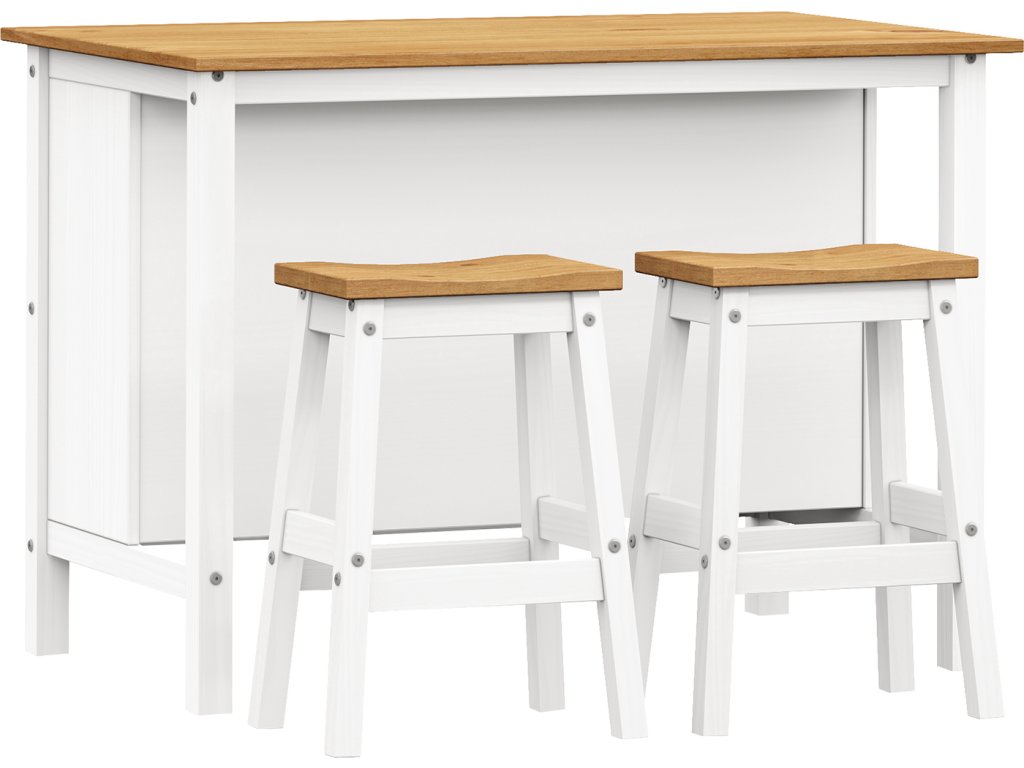 kuchyňský ostrůvek 11001B a 2 barové stoličky 13293B CORONA 2 materiál masiv borovice voskovaná v bílém a medovém odstínu rozměr ostrůvku (š/h/v) 126 × 77 × 91 cm, 1 police rozměr barové stoličky (š/h/v) 44 × 30 × 63 cm součást sestavy Corona 2