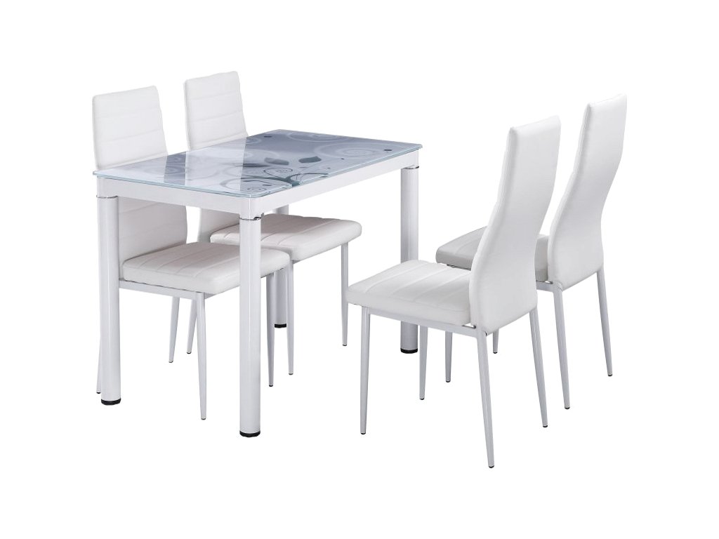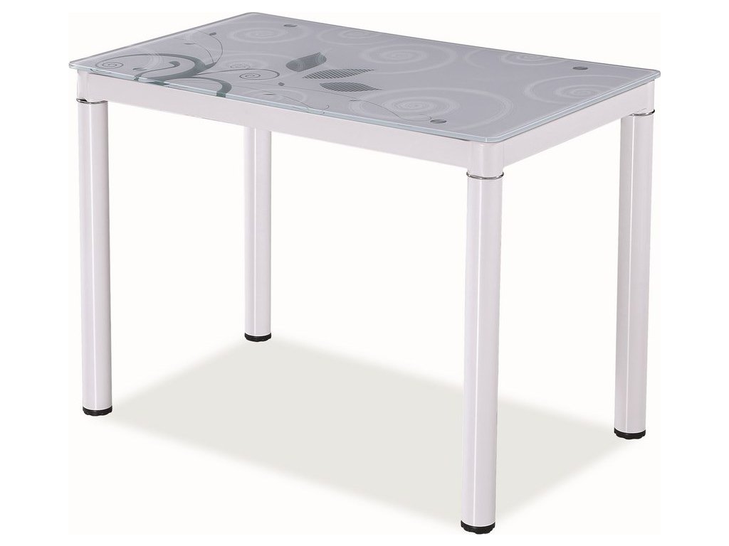Moderní jídelní stůl v elegantním a praktickém provedení. Nohy stolu jsou vyrobeny z kovu, lakované bílou barvou, deska je z tvrzeného skla v bílé barvě. Na desce stolu jsou jemné, velmi elegantní moderní kresby v bílých odstínech. Stůl je určen pro 4 osoby. K tomuto stolu doporučujeme židle z naší nabídky.Doplňkové parametry