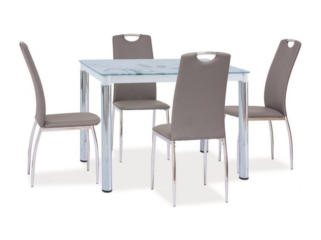 Moderní jídelní stůl v elegantním a praktickém provedení. Nohy stolu jsou vyrobeny z pochromovaného kovu, deska je z tvrzeného skla v bílé barvě. Na desce stolu jsou jemné, velmi elegantní moderní kresby. Stůl je určený pro 4 osoby. K tomuto stolu doporučujeme židle z naší nabídky.Doplňkové parametry