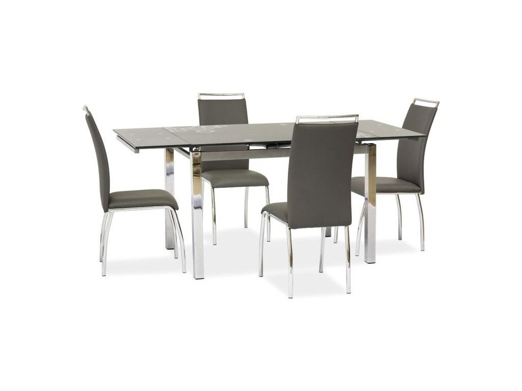 Moderní rozkládací jídelní stůl, kovová konstrukce je pochromovaná, vrchní rozkládací deska je z tvrzeného skla v šedé barvě, tloušťka skla je 1 cm. Rozkládací části ( každá 30 cm ) se nacházejí na dvou protilehlých stranách. Plocha stolu před rozložením je 110 x 74 cm, plocha stolu po rozložení 170 x 74 cm. Stůl je vhodný pro 4-6 osob. K tomuto stolu doporučujeme židle v naší uvedené nabídce. Dodáváme v demontovaném stavu.Doplňkové parametry