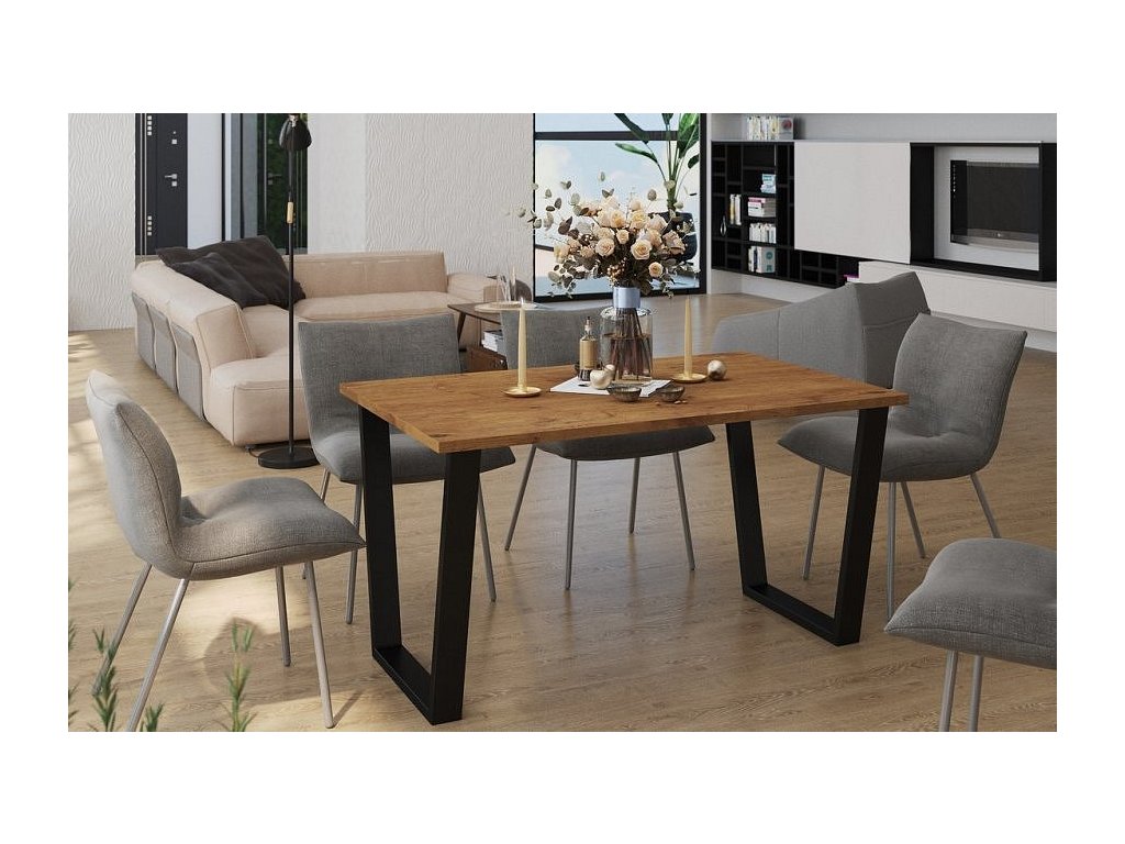 Jídelní stůl je vyroben v jednoduchém industriálním, stylovém a zároveň i moderním designu. Stolová deska je vyrobena z lamina tl.28 mm v barvě dub lancelot, kovové nohy jsou práškově lakované v černé barvě (profil nohy 80x40 mm). Tyto jídelní stoly nabízíme v různých rozměrech a barvách. Dodáváme v demontovaném stavu.Doplňkové parametry