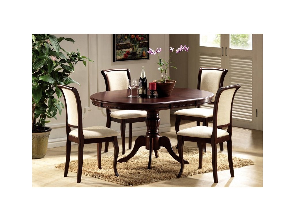 Elegantní jídelní stůl v rustikálním duchu. Zajímavý vzhled stolu vyzdvihují jemné tvary a dokonalé detaily. Tento kulatý stůl je vyroben z přírodního dřeva, deska stolu je z kvalitní MDF, barevné provedení - tmavý ořech. Plocha před rozložením je 106 x 106 cm, po rozložení 106 x 141 cm. Výška stolu je 76 cm. Stůl je určený pro 4 až 6 osob. K tomuto stolu doporučujeme židle v naší nabídce.Doplňkové parametry