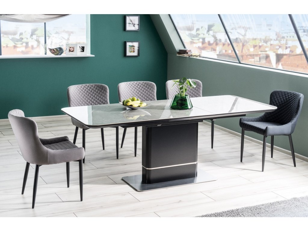 Elegantní rozkládací jídelní stůl v luxusním provedení. Stůl je vyroben z kvalitní MDF lakované matnou černou barvou odolnou proti oděru v kombinaci s italskou keramikou v imitaci šedého mramoru. Podstavec je v kombinaci s leštěnou ocelí. Stůl je určen až pro 8 osob. K tomuto stolu doporučujeme židle z naší nabídky. Plocha stolu před rozložením je 90 x 160 cm, plocha stolu po rozložení je 90 x 210 cm. Dodáváme v demontovaném stavu.Doplňkové parametry