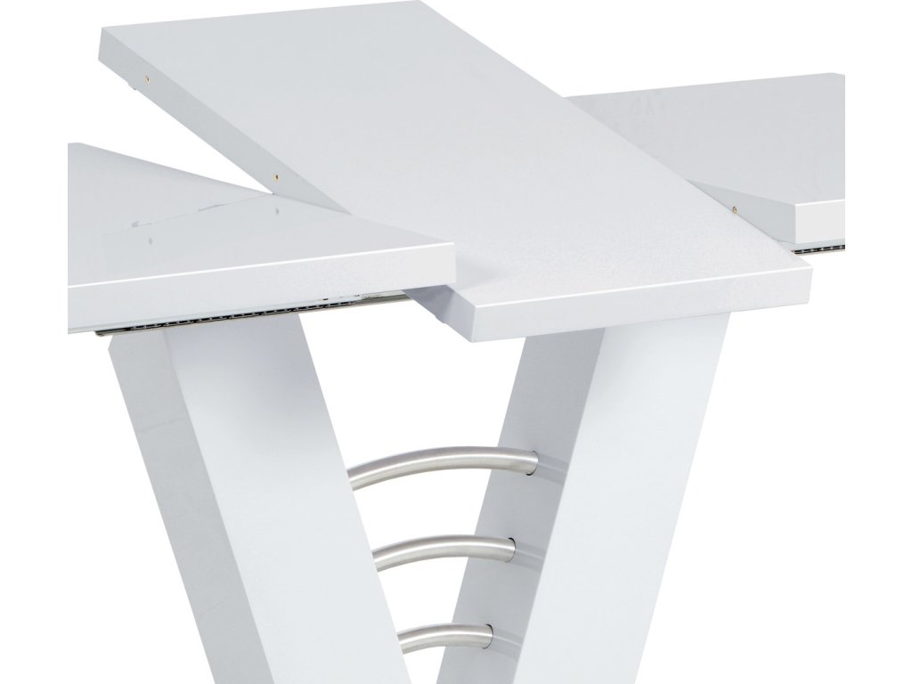 Rozkládací jídelní stůl o rozměrech 120+40x80 cm v bílém lesklém provedení nabízí moderní design a praktickou funkci rozkladu. Deska stolu je vyrobena z MDF s lesklou povrchovou úpravou, která zajišťuje snadnou údržbu a odolnost proti poškrábání. Stabilní nohy jsou rovněž z MDF a doplněné o dekorativní prvky z broušeného nerezu, které podtrhují současný vzhled stolu. Mechanismus rozkladu umožňuje jednoduché a plynulé zvětšení pracovní plochy o 40 cm, což oceníte při větších rodinných setkáních nebo návštěvách. Pevná konstrukce a kvalitní materiály zaručují stabilitu a dlouhou životnost nábytku.Doplňkové parametry