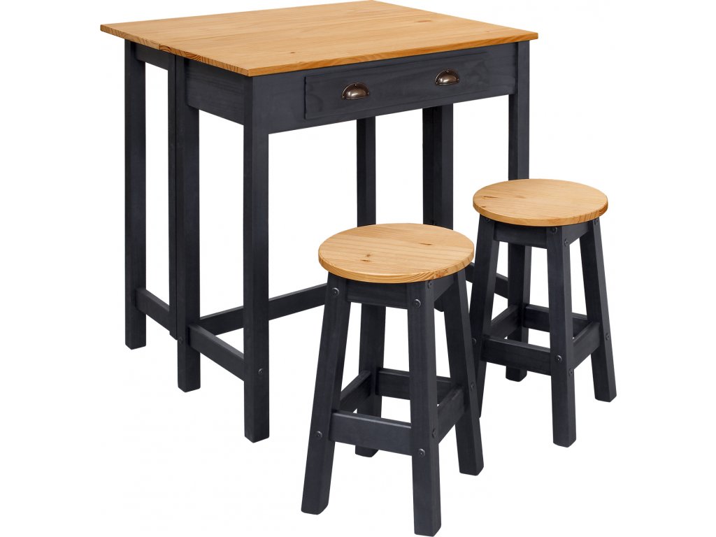 materiál masiv borovice voskovaná v medovém a černém odstínu skládací stůl se zásuvkou, dvě barové židličky rozměr složeného stolu (š/h/v) 80 × 42 × 84 cm rozměr rozloženého stolu (š/h/v) 80 × 72 × 84 cm rozměr židličky (š/h/v) 30 × 30 × 51 cm