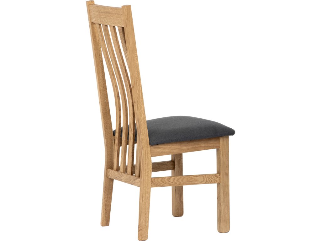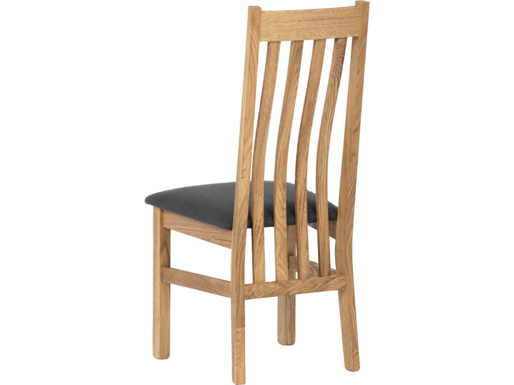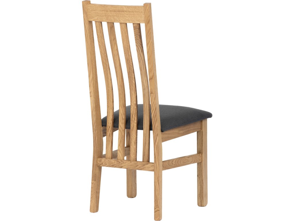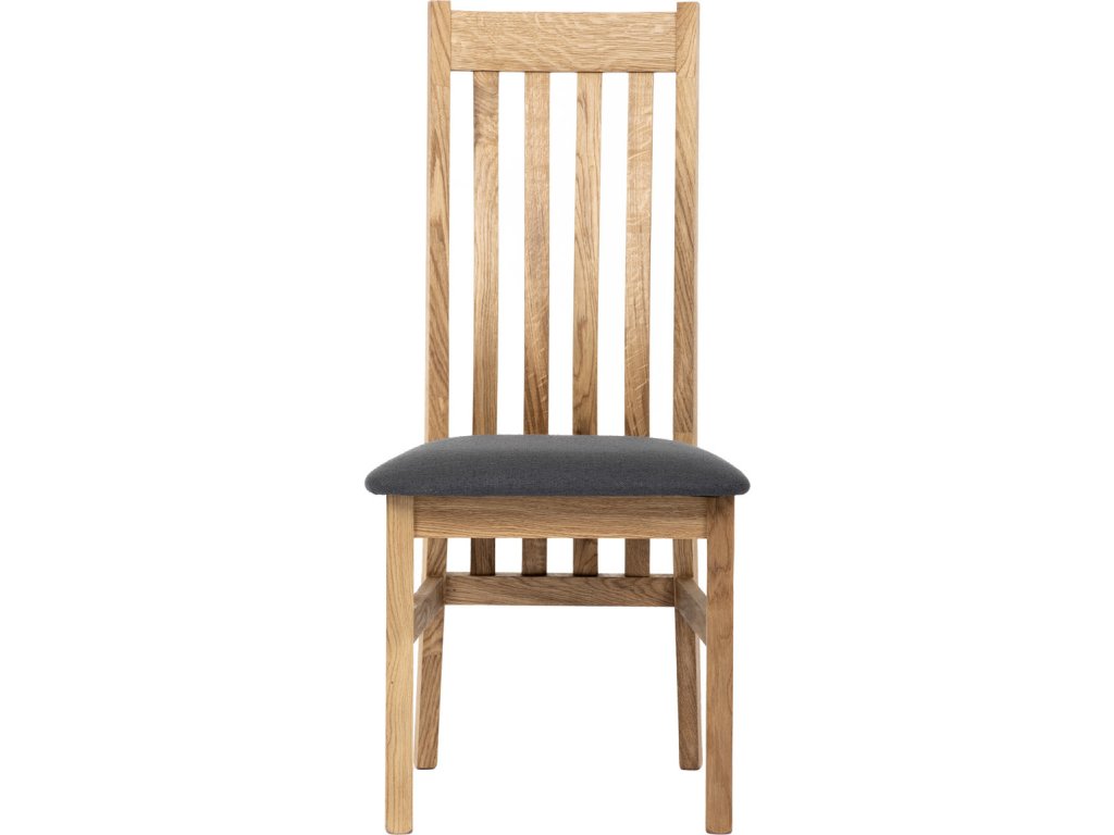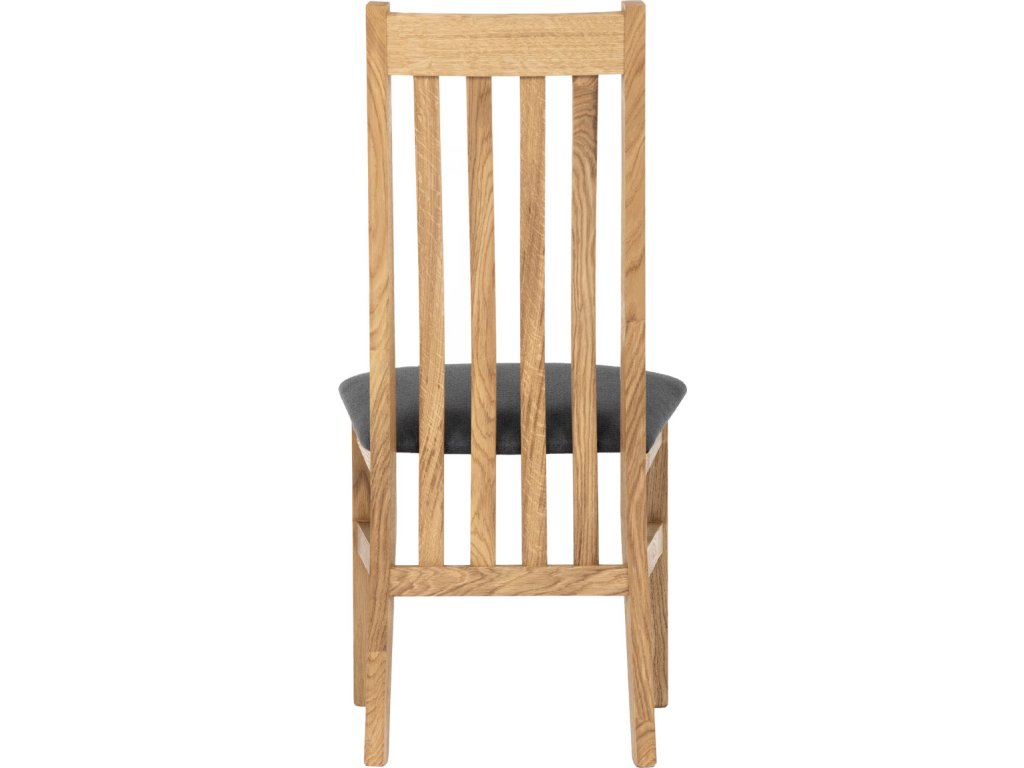 Dřevěná jídelní židle z masivního dubového dřeva je demonstrací dokonalé řemeslné práce. Zaujme nejen svým rustikálním stylem, ale i perfektním zpracováním. Styl vychází z minimalistického severského designu, v temnějším nádechu přírodního odstínu. Tato barevnost skvěle vykreslí léta dubu a podtrhne její provedení. Čisté linie a vysoce kvalitní řemeslné zpracování dřevěného masivu nastavuje okouzlující akcenty a podtrhuje útulnou atmosféru v interiéru. Tato židle Vás zve nejen k odpočinku, ale rozjímání s rodinou i přáteli, kde oceníte ergonomicky tvarované vzpěry opěradla, kopírující zakřivení páteře. Pohodlný sedák je potažen odolnou látkou z polyesterových vláken, v antracitově šedém barevném odstínu. Polstrování je kvalitní PU pěnou. O kvalitě potahové látky Vás jistě přesvědčí její parametry - gramáž 340 g/m2, martindale naprosto skvělých 80 000 cyklů a barevná stálost na světle je na stupni 5. Povrchová úprava dubové masivní konstrukce je tvrdovoskovým olejem, speciálně určeným pro dlouhodobé ošetření dřeva. Velkým bonusem této židle je její dodání v kompletně smontovaném stavu a se spoji lepenými (!). Tím odpadá nejen nepříjemné studium montážního návodu a následně i montáž, ale židle bude stále pevná a nehrozí, že budete muset v pravidelných cyklech utahovat povolené šrouby. Další pevnostní prvek slouží i trnože mezi nohama. Toto vše dělá ze židle pevný a velice trvanlivý celek s nosností až 140 kg. Elegantním prvkem bude v klasicky laděných interiérech společně s masivním dubovým stolem, ale i kombinace se stolem ve stylu Loft bude velmi zajímavá a nepřehlédnutelná.Doplňkové parametry