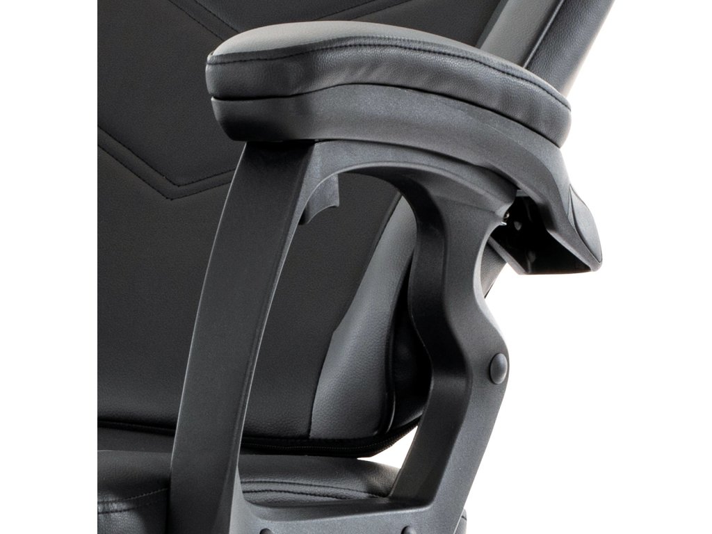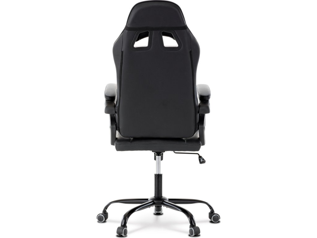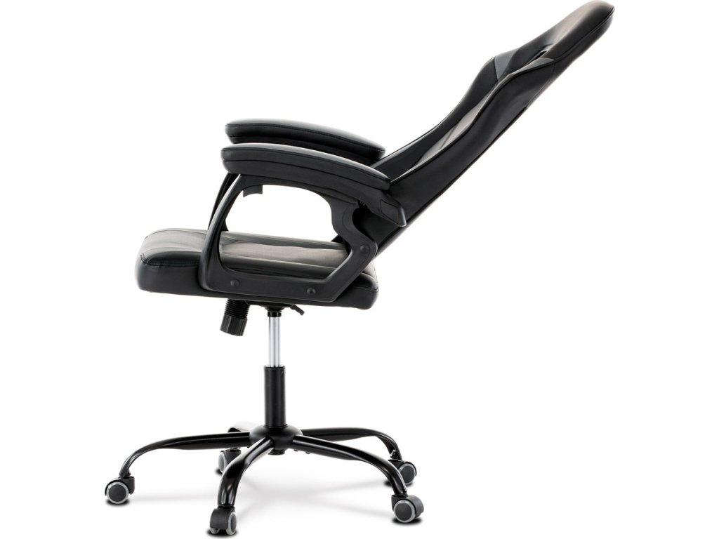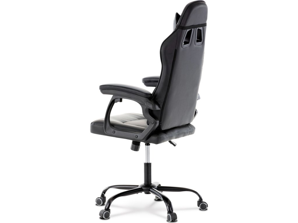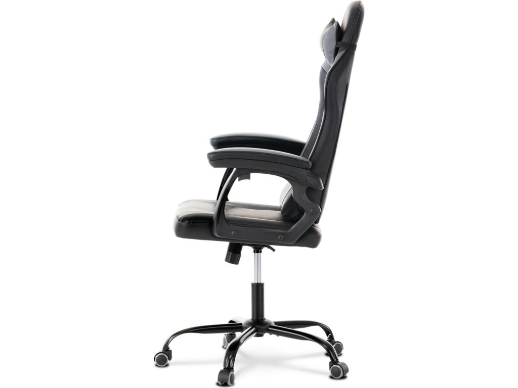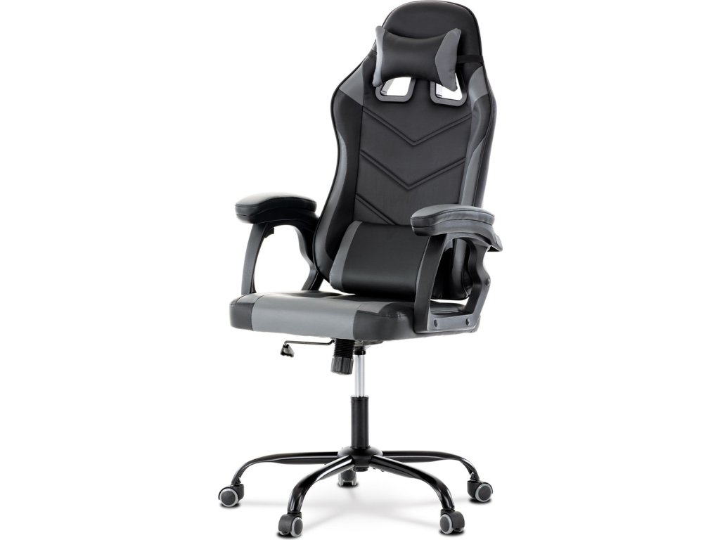 Herní křeslo v designu sedačky závodního vozu a zaoblenými liniemi a novou funkcí opěráku. Potah je kombinace černé, do V prošívané ekokůže a šedé ekokůže na okrajích sedáku i opěráku a odnímatelných polštářcích. Polstrování je z kvalitní PU pěny. Židle je vybavena houpacím mechanismem s nastavením protiváhy a aretací v základní poloze. Tuhost protiváhy lze regulovat velkým plastovým šroubem, umístěným pod sedákem. Výška sezení se upravuje páčkou na pravé straně přes kvalitní plynový píst. Ruce unavené od klávesnice a rychlé myši si můžete pohodlně položit na plastové područky, na ložné ploše polstrované černou a šedou ekokůží. Opěrák je vyšší s designovými otvory v horní části lemovanými černými plastovými výlisky. Ty dodávají židli nejen potřebný závodní vzhled (otvory na bezpečnostní pásy), ale také usnadňuje manipulaci. Kříž je kovový, lakovaný černou barvou. Jednotlivé paprsky jsou šroubované k centrálnímu nosníku s pístem. Kolečka jsou plastová, vhodná na koberce. Nosnost židle je až 120 kg. Jako novou funkci můžete využít několikanásobné polohování opěráku, a to až do 135°. Stačí jen zmáčknou tlačítko umístěné pod područkami a opěrák společně s područkami se bude posouvat do stále větší relaxační polohy.Doplňkové parametry