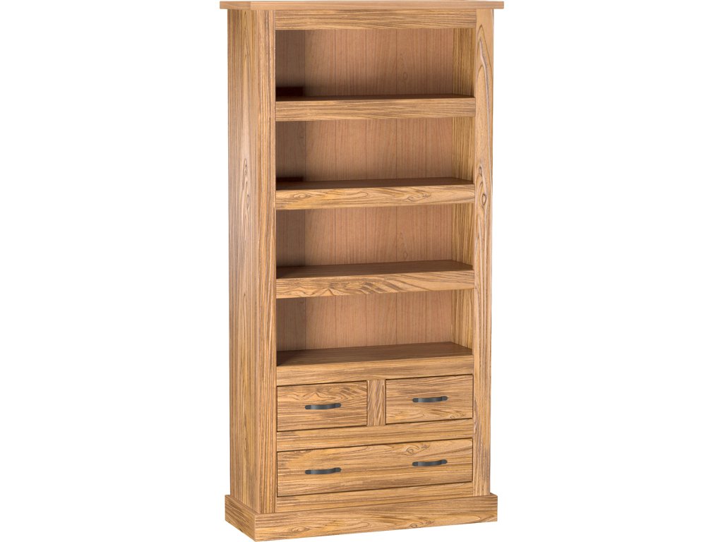 materiál masiv borovice, barevné provedení dub antik lakováno čirým lakem, vlis dřevěné struktury tři police, jedna široká a dvě úzké zásuvky součást sestavy EL DORADO