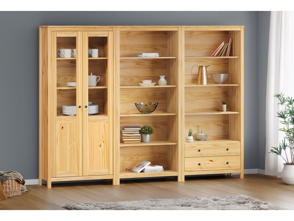 sestava knihoven TORINO 8070 a 8071K a vitríny TORINO 8072K materiál masiv borovice, lakované provedení kovové úchytky knihovna 8070: čtyři police knihovna 8071K: tři police, dvě zásuvky s kovovými pojezdy vitrína 8072K: dvoje částečně prosklené dveře, čtyři police rozměr knihovny 8070 (š/h/v) 85 × 37 × 190 cm rozměr knihovny 8071K (š/h/v) 85 × 37 × 190 cm rozměr vitríny 8072K (š/h/v) 85 × 37 × 190 cm