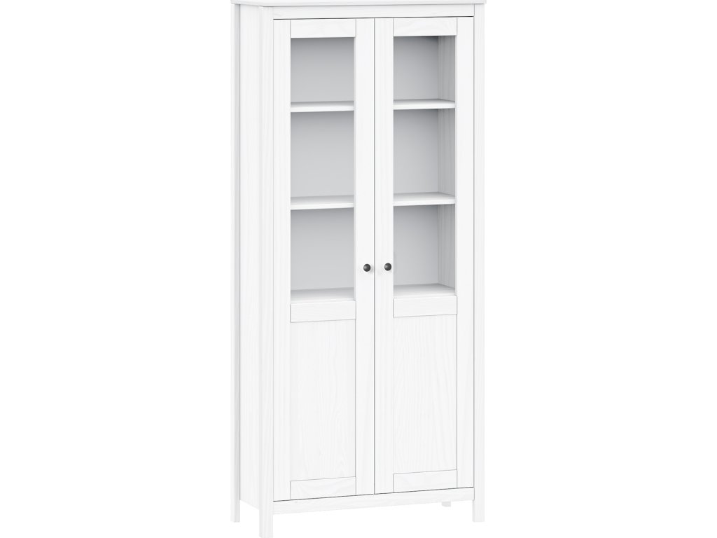 materiál masiv borovice, barevné provedení bílý lak kovové úchytky dvoje částečně prosklené dveře, čtyři police