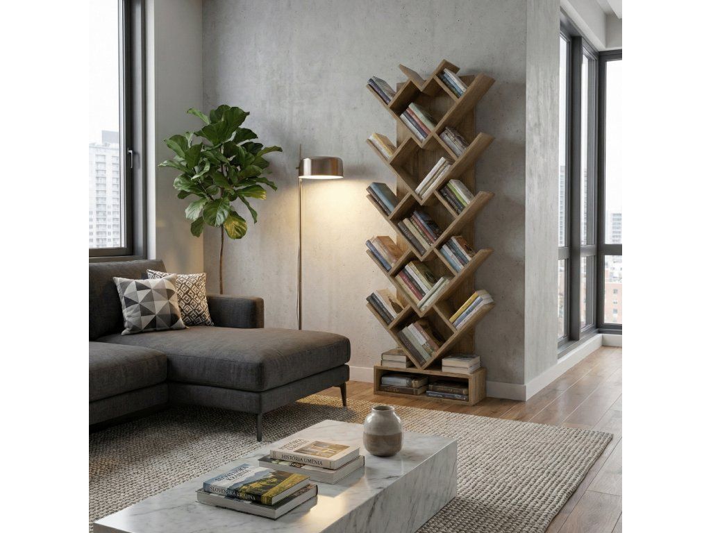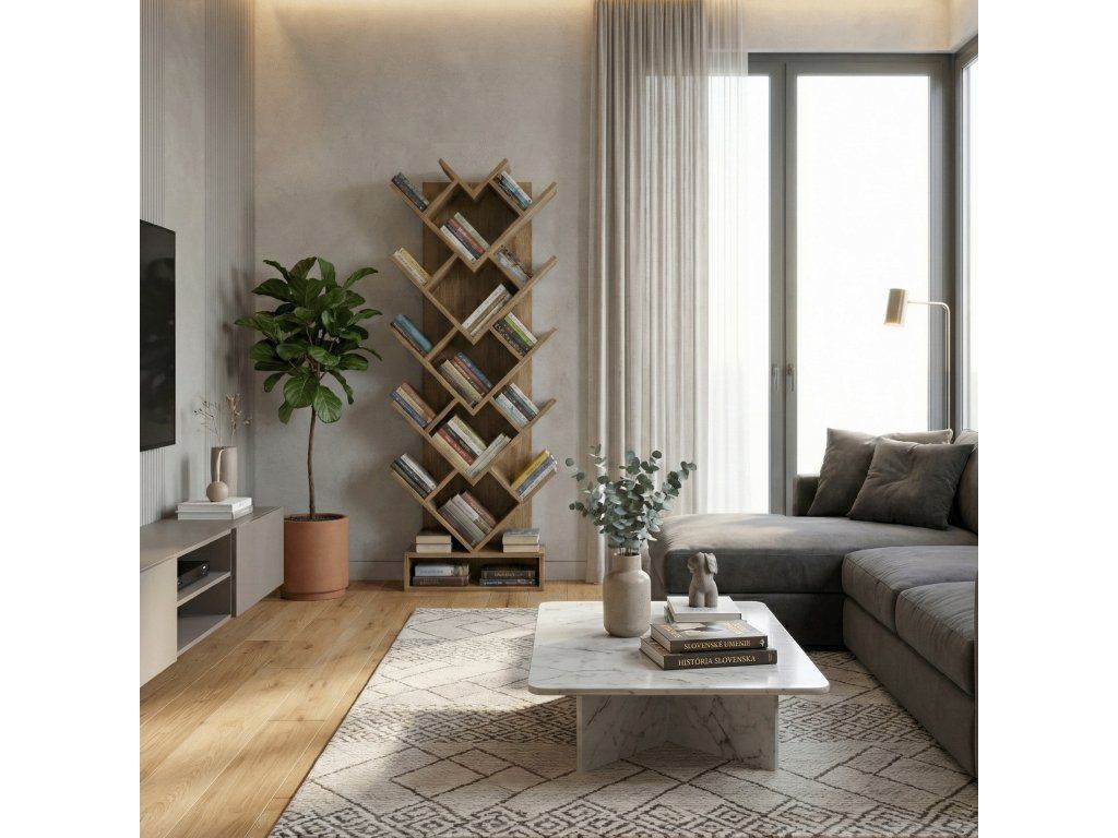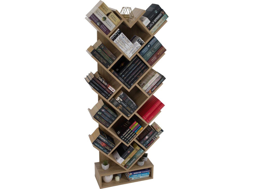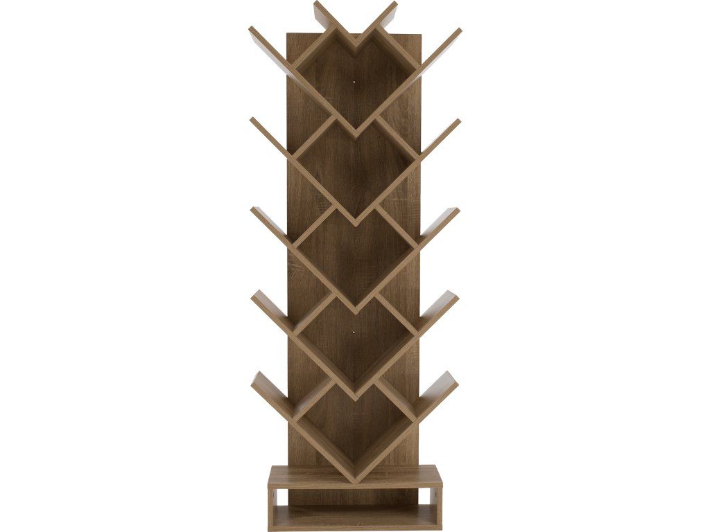 Materiál: DTD Barva: hnědošedá dub Rozměry (ŠxHxV): 59x21,6x150 cm Tloušťka materiálu: 15 mm poutavý design Netradičně rozvržené police Víceúčelový Dodáván v demontu
