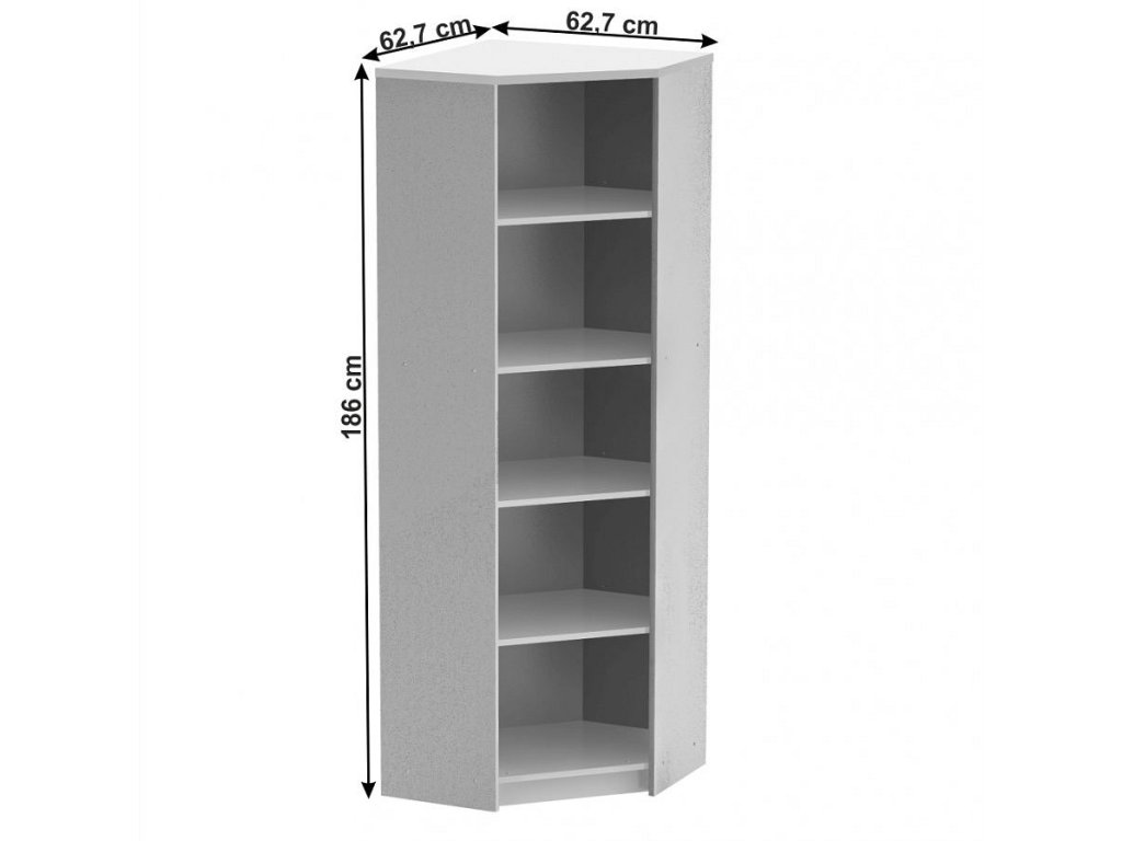 Rohový kancelářský regál JOHAN 2 NEW 09 se čtyřmi policemi Barevné provedení: bílá Materiál: DTD lamiovaná Rozměry (ŠxHxV): 62,7x62,7x186 cm Tloušťka materiálu: 16/22 mm slovenský výrobek ABS hrany Dodávané v demontu