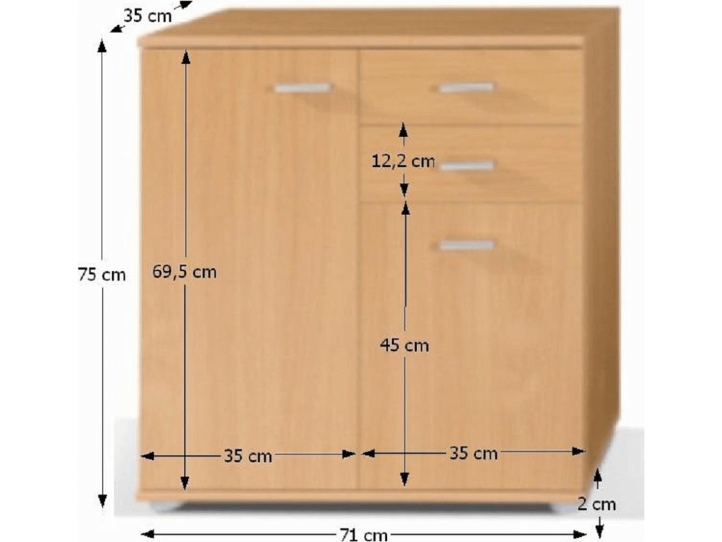 Komoda 2-2T2S se dvěma skříňkami a dvěma šuplíky Materiál: DTD laminovaná Barva: buk Rozměry (ŠxHxV): 71x35x75 cm Dodávané v demontu.