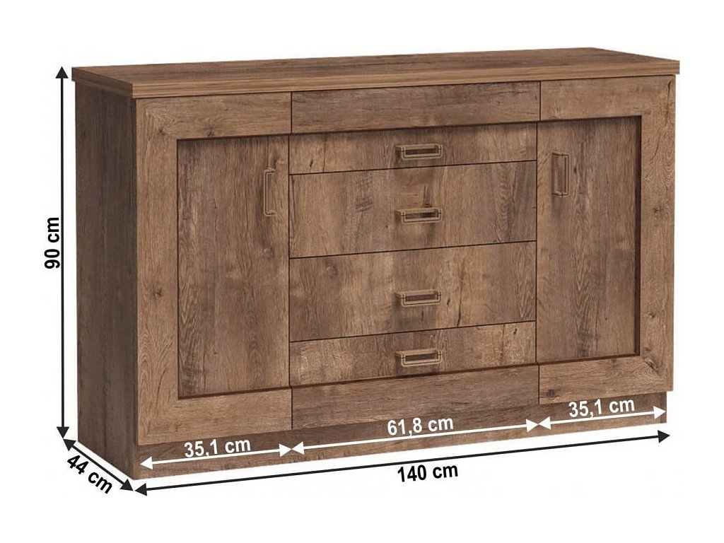 Komoda TEDY TYP T6 Materiál: DTD laminovaná / ABS hrany / MDF Barva: dub lefkas Rozměry (ŠxHxV): 140x44x90 cm Tloušťka materiálu: 32 mm Tloušťka materiálu zbývající části: 16 mm Dodávané v demontu.