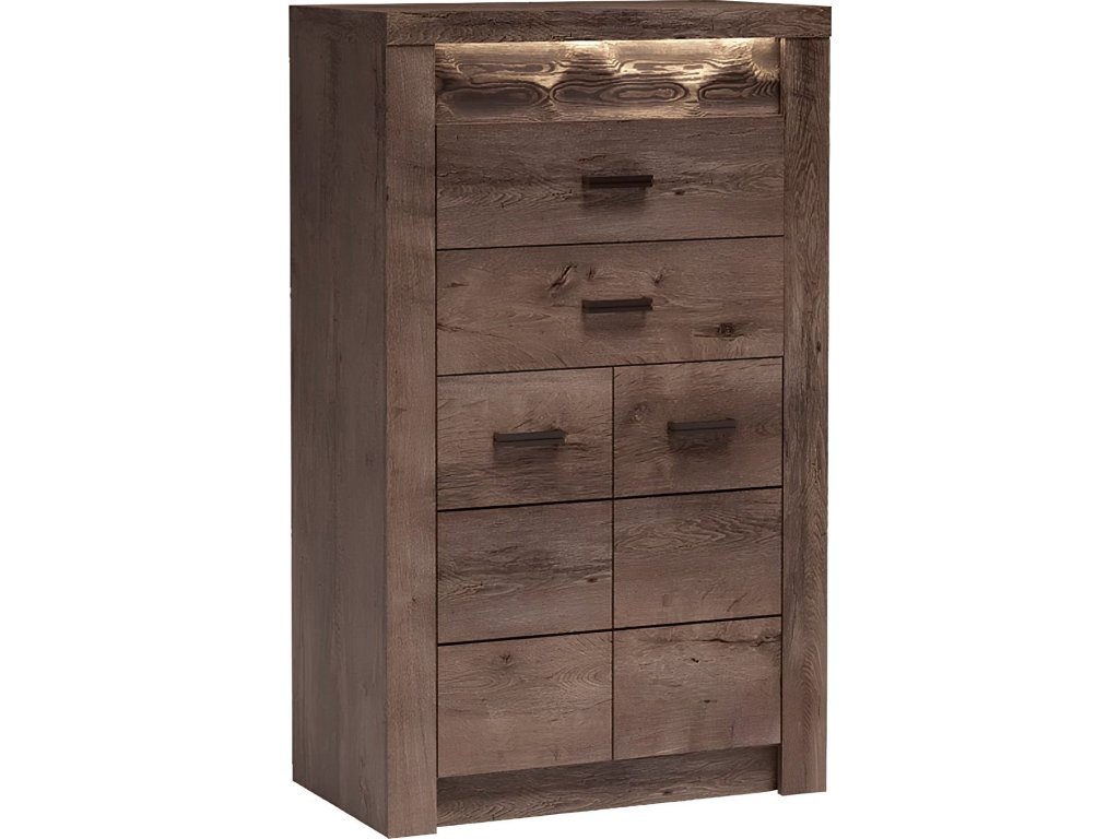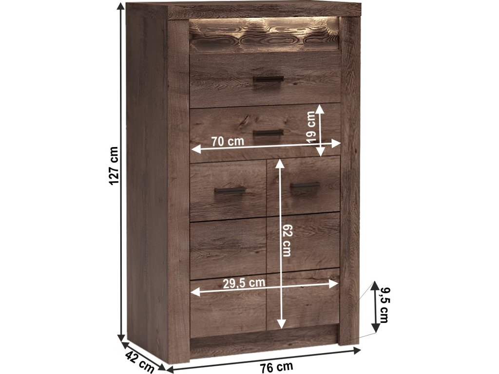 Komoda Infinity I-06 Korpus hrubý až 48 mm, Tloušťka materiálu zbývající části: 16 mm, úchytky kovové Materiál DTD laminovaná, ABS hrany, barevné provedení: jasan tmavý, Rozměry ŠxHxV: 76x42x127 cm. Možnost dokoupení LED osvětlení v ceně 840 Kč. Dodávané v demontu.