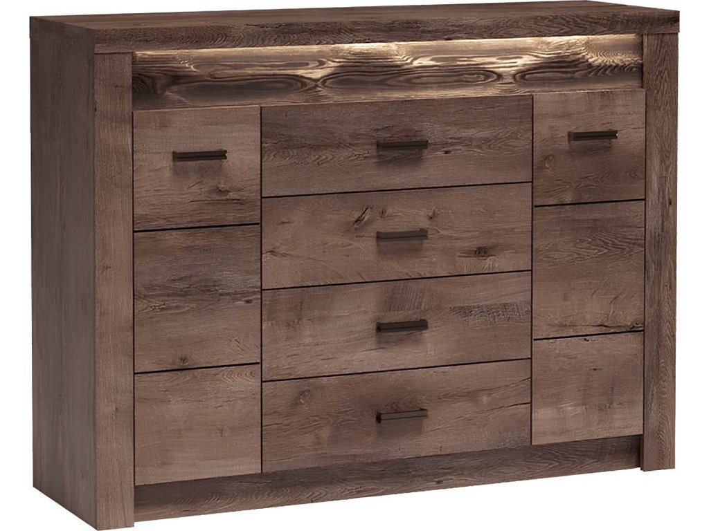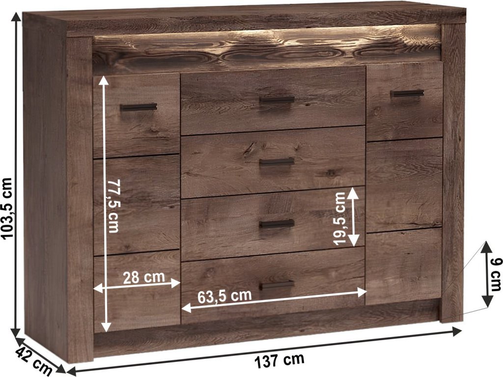 Komoda 07 z luxusního sektorového nábytku. Korpus hrubý až 48 mm, Tloušťka materiálu zbývající části: 16 mm, úchytky kovové Materiál DTD laminovaná, ABS hrany, Barevné provedení: jasan tmavý, Rozměry ŠxHxV: 137x42x103,5 cm. Podsvícená deska z masivního dřeva Dodávané bez LED osvětlení Možnost dokoupení LED osvětlení v ceně 1090 Kč. Dodávané v demontu.